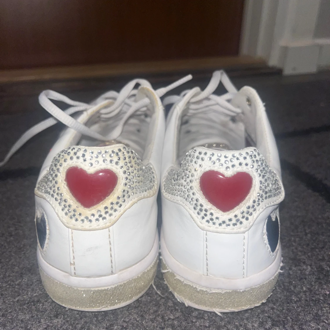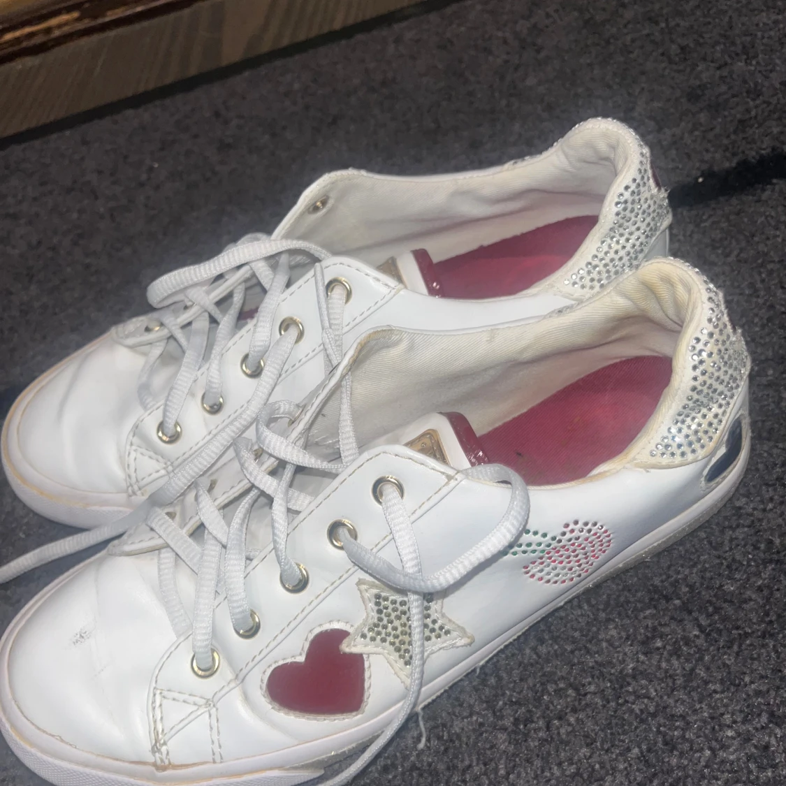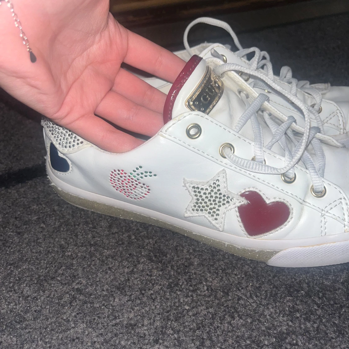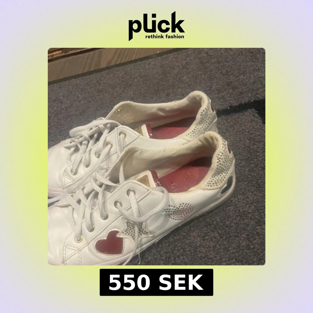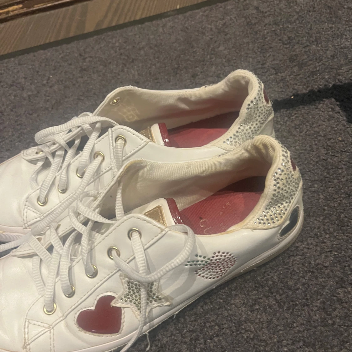 Snygga vita sneakers från Guess med röda hjärtan, glittriga stjärnor och detaljer i silver. Skorna har snörning, guldfärgade öljetter och glittriga partier vid hälen. Dekorativa mönster med körsbär och hjärtan på sidorna ger en vintage.