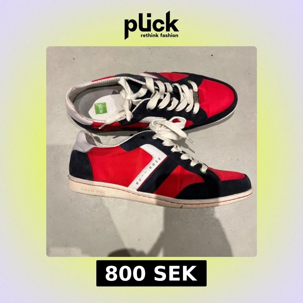 Snygga sneakers från Hugo Boss i rött, marinblått och vitt. Skorna är knappt använda och ser nästan oanvända ut! Kontakta för mer info!