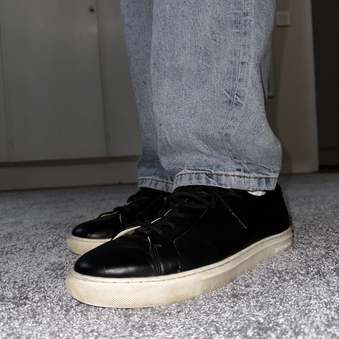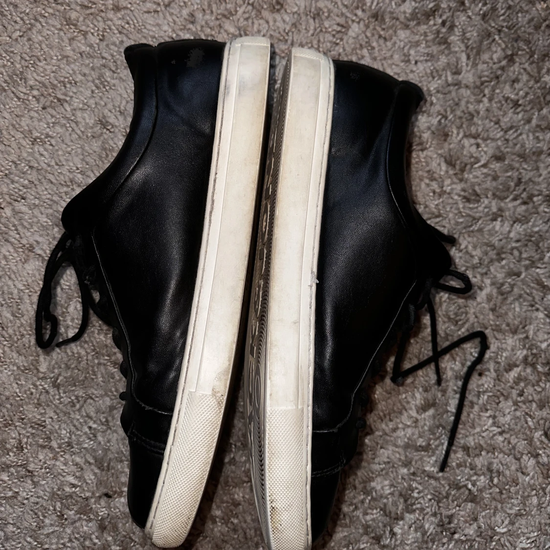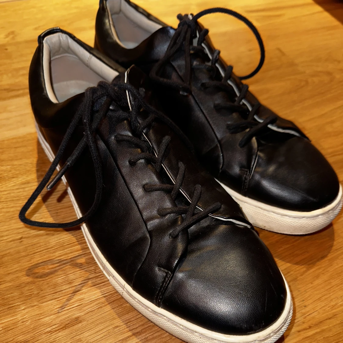 Storlek 45, från Jack and Jones. Imitationsläder, på sidorna och på framsidan är det lite skavt. Skorna är endast avtorkade.