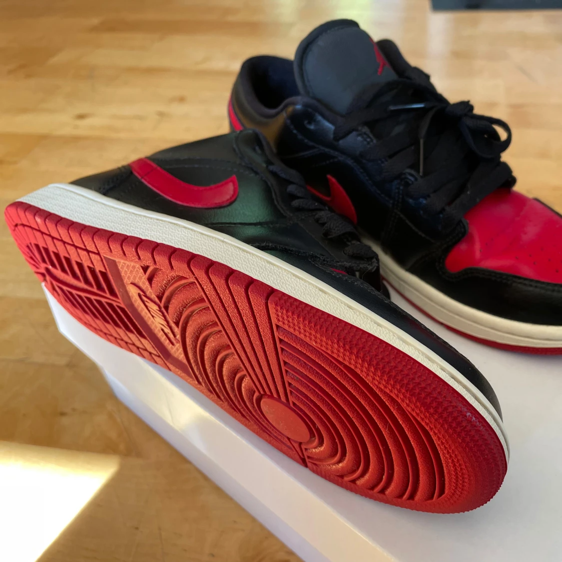Hej! Jag säljer dessa snygga jordan 1 low skorna eftersom jag tyvärr växt ur dom. Skorna är lite använda och är i mycket gott skick. Orginal kartong ingår