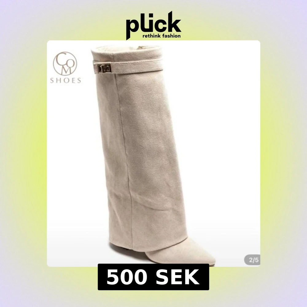 Säljer ett par trendiga beige i mjuk mocka. De har en spetsig tå, platt sula och dekorativt spänne upptill. Stövlarna har dragkedja på insidan för enkel påtagning. De är fodrade inuti så perfekt inför höst/vinter/vår🍁