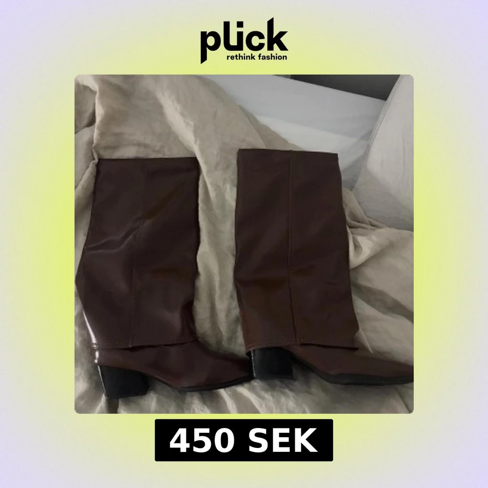 Aldrig använda snygga bruna stövlar i skinnimitation med spetsig tå och markerad klack. Stövlarna är även glansiga