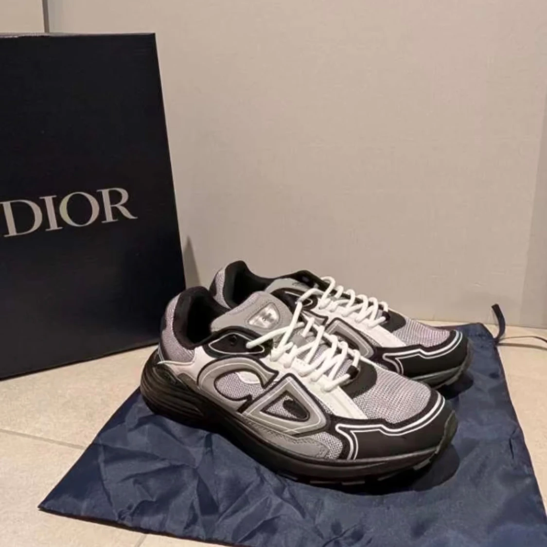 (PRIS KAN DISKUTERAS!) Säljer ett par Dior B30 sneakers i svart och vitt med stora CD-loggor på sidorna. Skorna har chunky svart sula, mesh och skinnpaneler samt vita snören. Riktigt snygga och trendiga sneakers som sticker ut med sin futuristiska design.