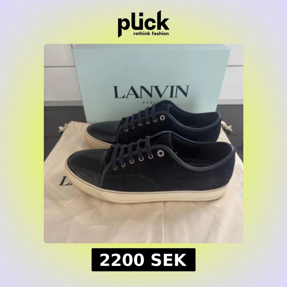 Snygga svarta sneakers från Lanvin med en kombination av mocka och skinn. Skorna har en rund tå och snörning framtill. Perfekta för en stilren look. Uk 12. Väldigt bra skick! Som nya.😇