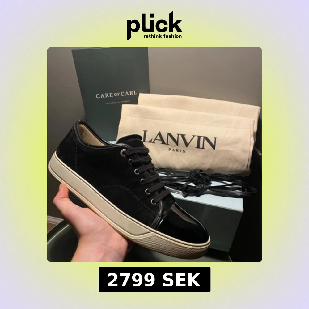 Säljer ett par svarta Lanvin sneakers med ovandel i mocka och detaljer i blankt skinn vid tån och hälen. Skorna har vita, platta sulor och klassisk snörning. Kommer med originalpåse och extra skosnören. Riktigt stilrena och lyxiga sneakers från Paris. Är som ny skick och är knappt använda. Köpta från Care of Carl för 5000kr