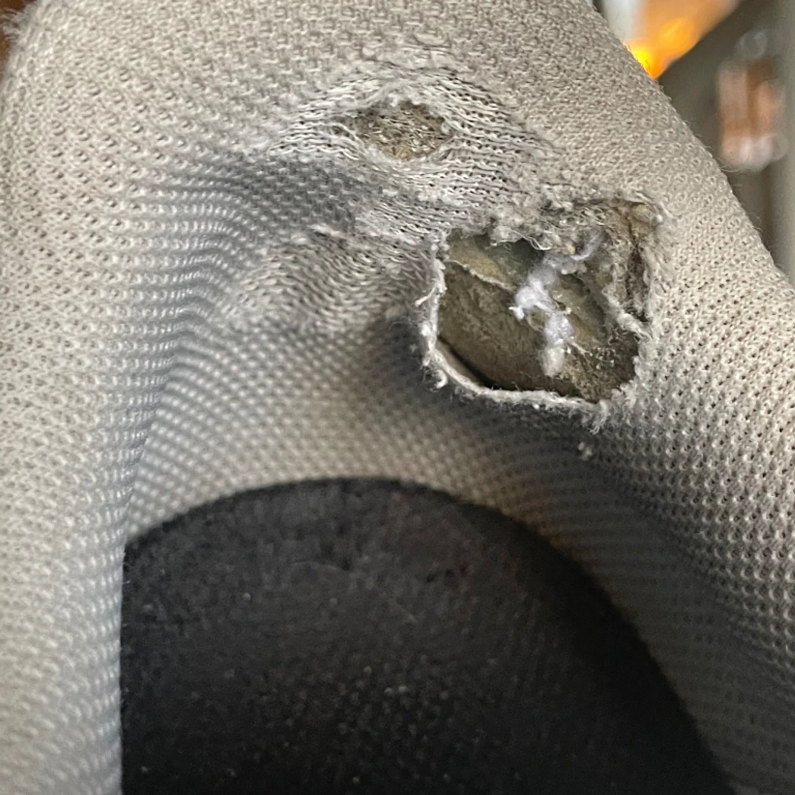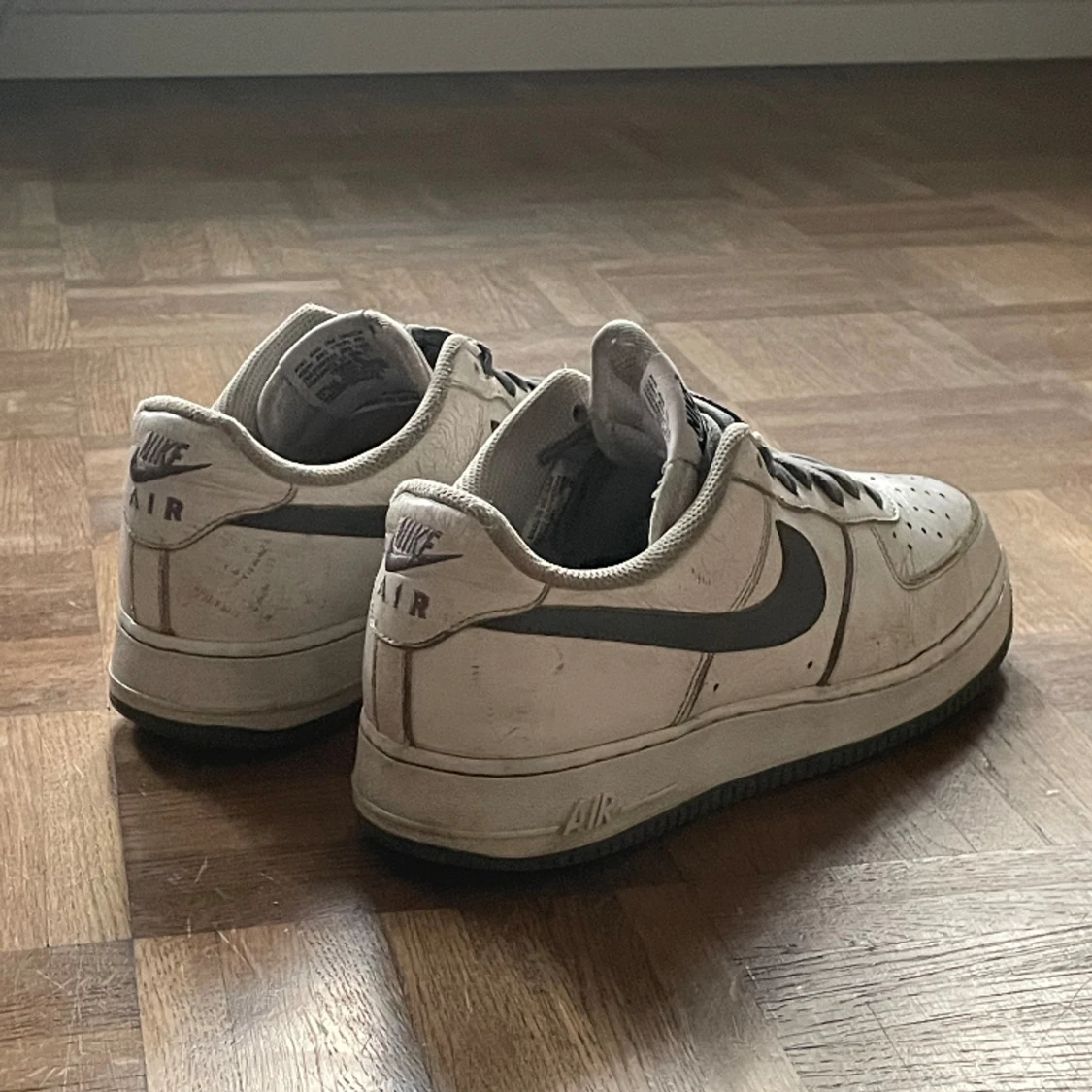 Air force 1 i storlek 41 Skorna är självdesignade och är vita med grå sula, snöre och logga. Skorna är använda och har en skada i högra hälen. (Se bild)