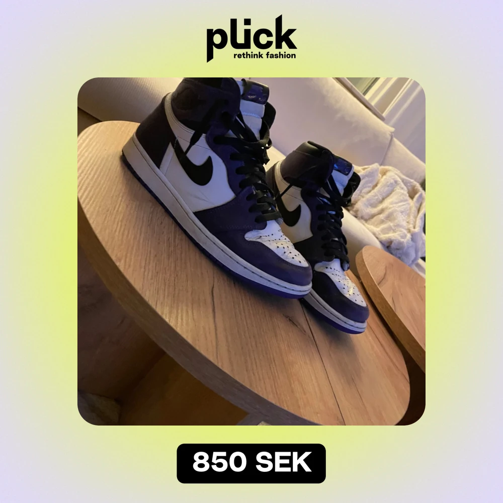 Jordan 1 high. Lila och vita, köpte för ungefär 1 år sedan. Har knappt använt själv, dom är ganska cressade där fram från förra ägaren. Där av priset
