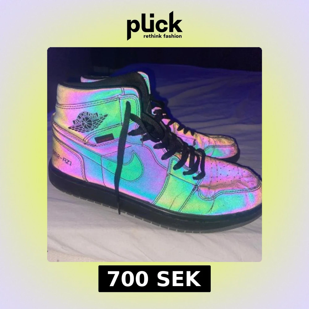 Säljer ett par unika reflekterande Nike Air Jordans med svart snörning. Skorna har en cool, skimrande yta som ändrar färg beroende på ljuset. Perfekta för att sticka ut i mängden!