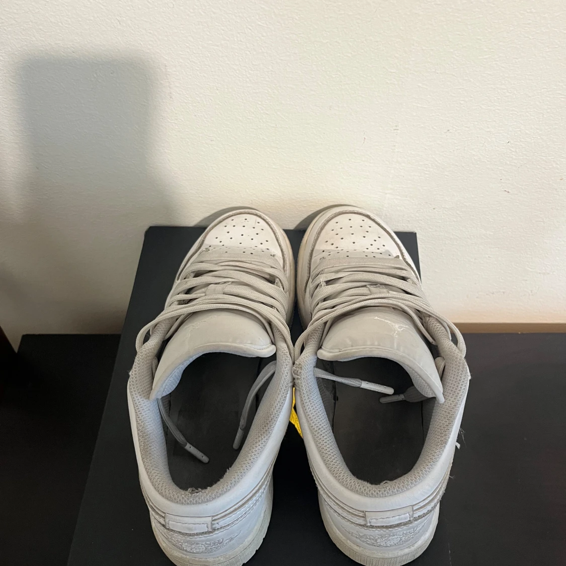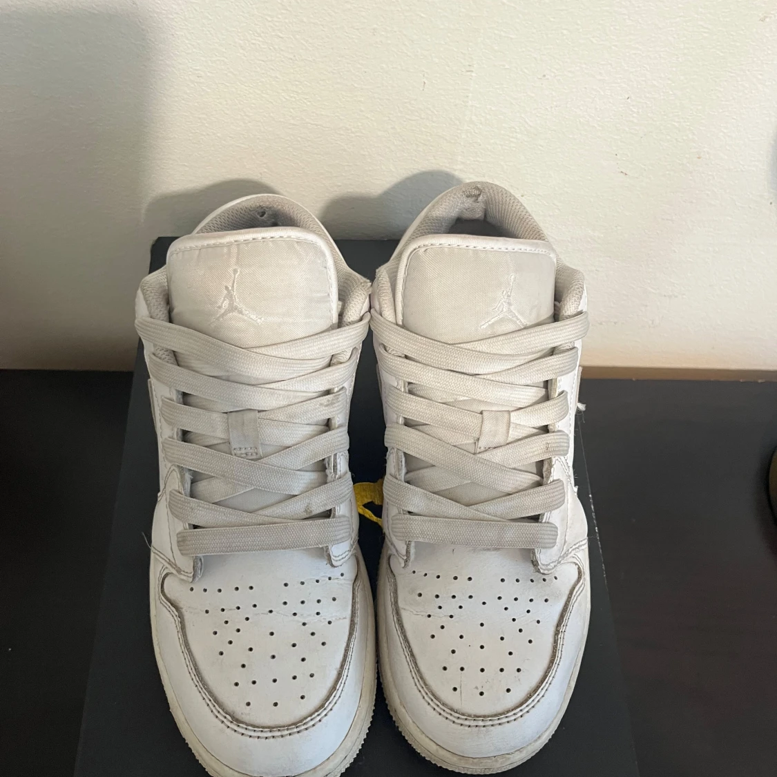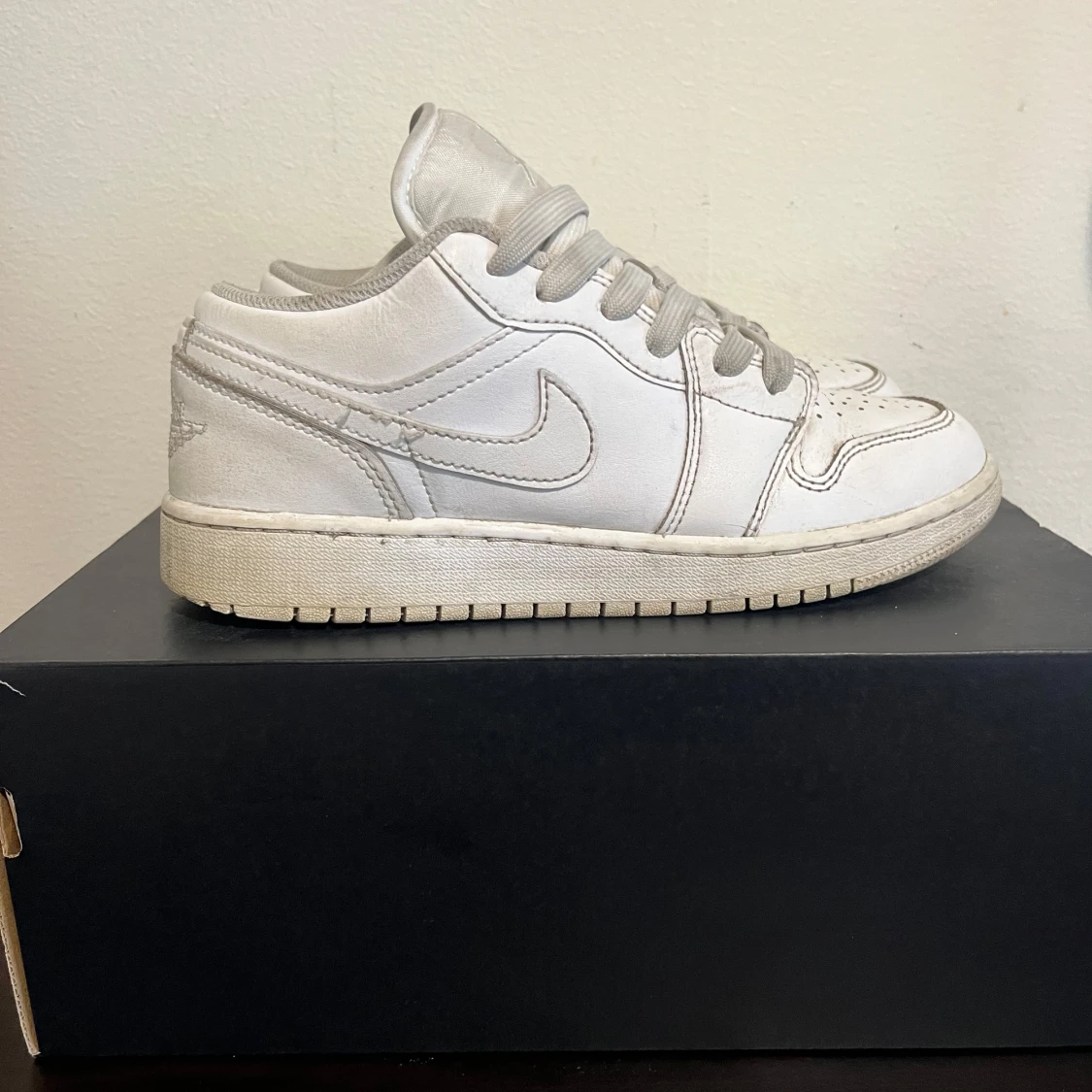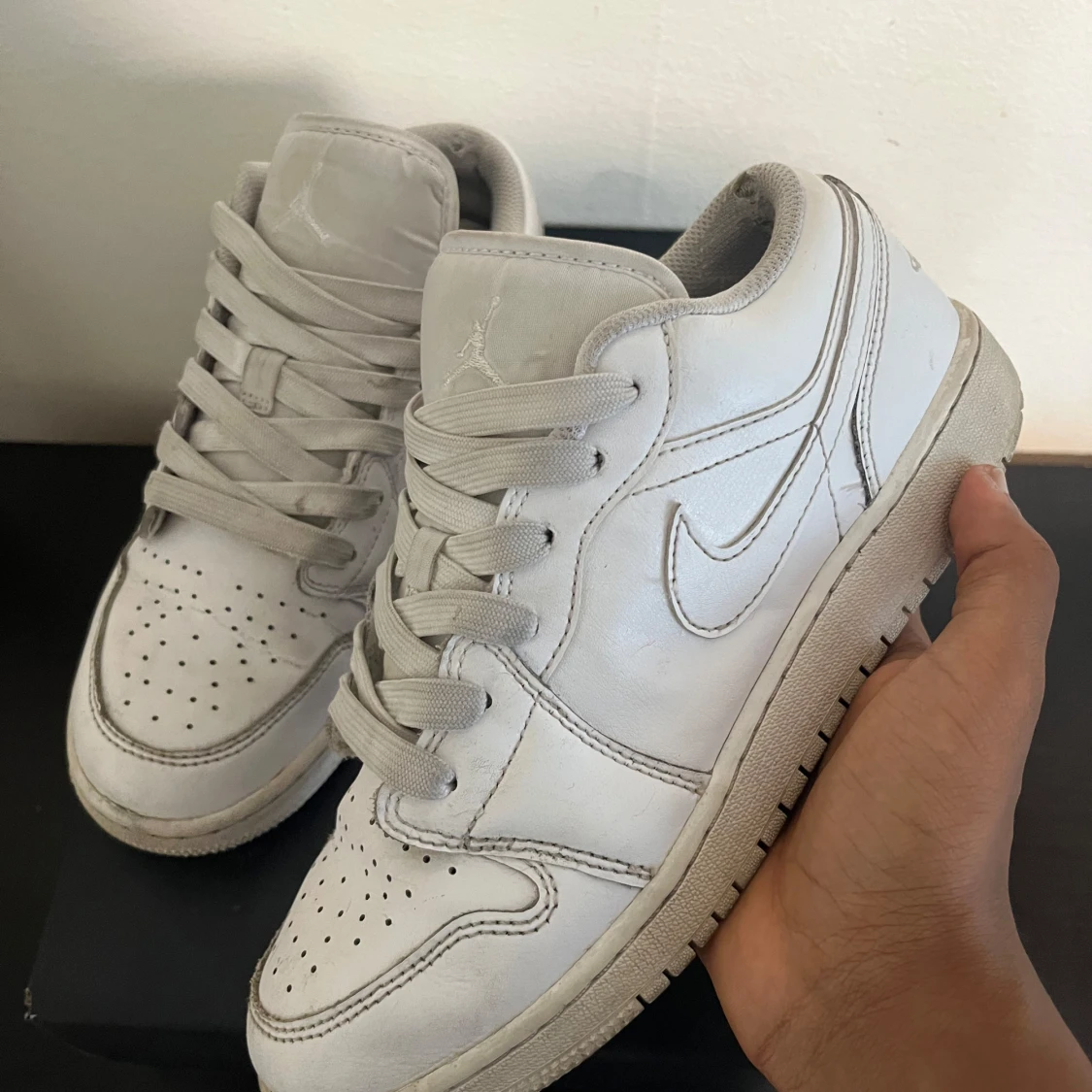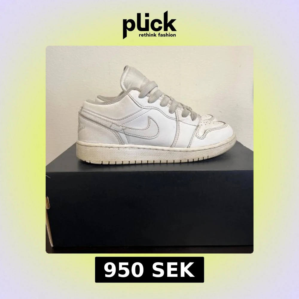 Snygga Nike Air Jordan 1 Low i helvitt skinn med klassisk swoosh på sidan och broderad Jumpman-logga på plösen. Skorna har perforerad tå, rund tå och platt sula. Perfekta för dig som gillar en clean och stilren look.