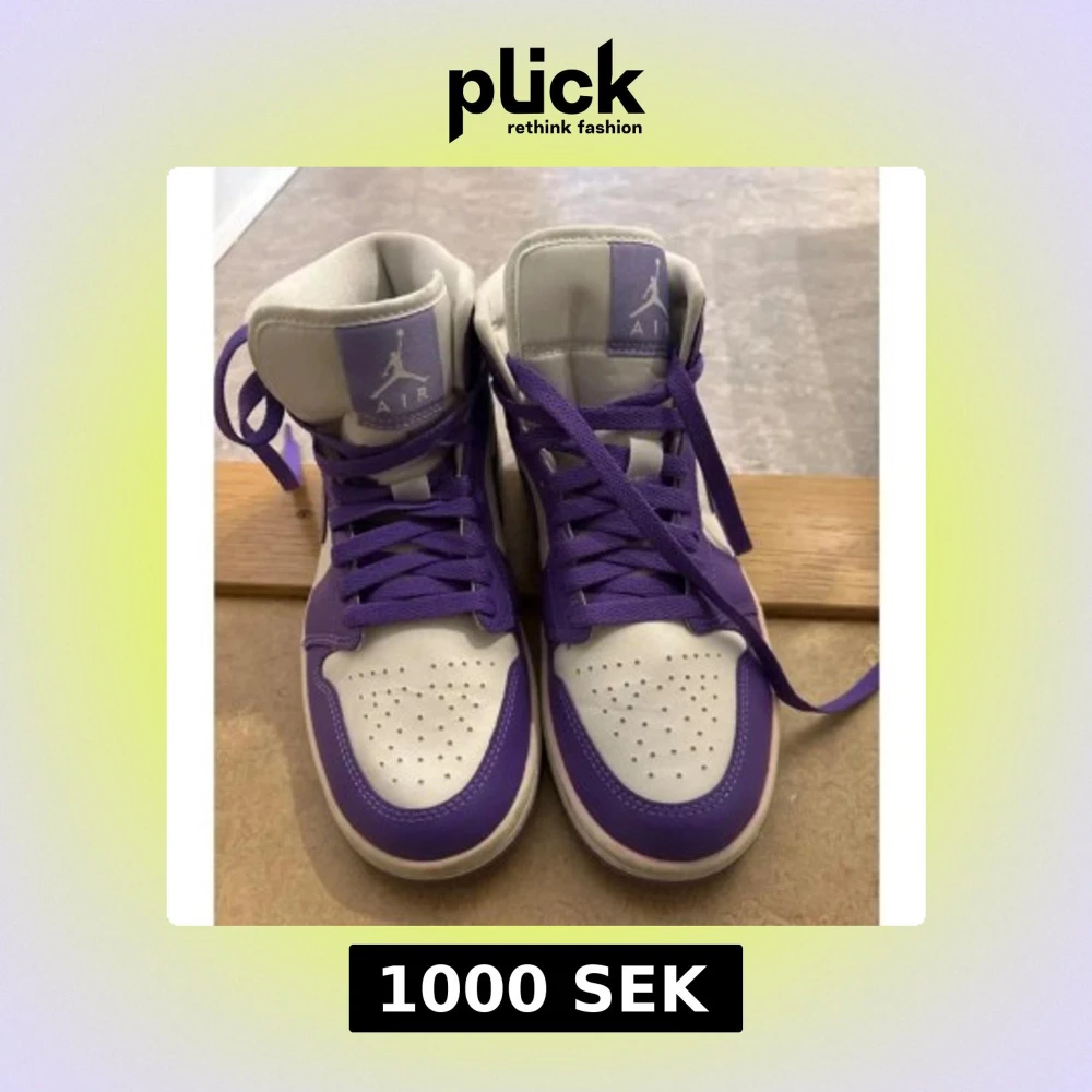 Nike Air Jordan 1 sneakers i lila och vitt med klassisk hög siluett. Skorna har lila snörning, perforerad tå och ikoniska Jumpman-loggan på plösen. Ovandelen är i skinn och textil, med vit bas och lila detaljer. Perfekta för dig som vill sticka ut med en färgstark look. Använda en gång