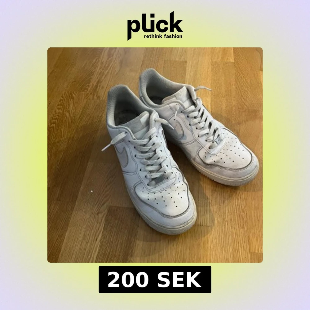 Klassiska Nike Air Force 1 sneakers i helvitt skinn med perforerad tå, rund tå och platt sula. Snygg och tidlös modell med snörning och diskret Nike-logga på sidan. Perfekta för dig som gillar streetstyle och vill ha en ikonisk sneaker i garderoben. Använda en del, bara att skriva så skickar jag fler bilder! Dom är creasade och inte helt vita som man ser på bilderna annars inga defekter!