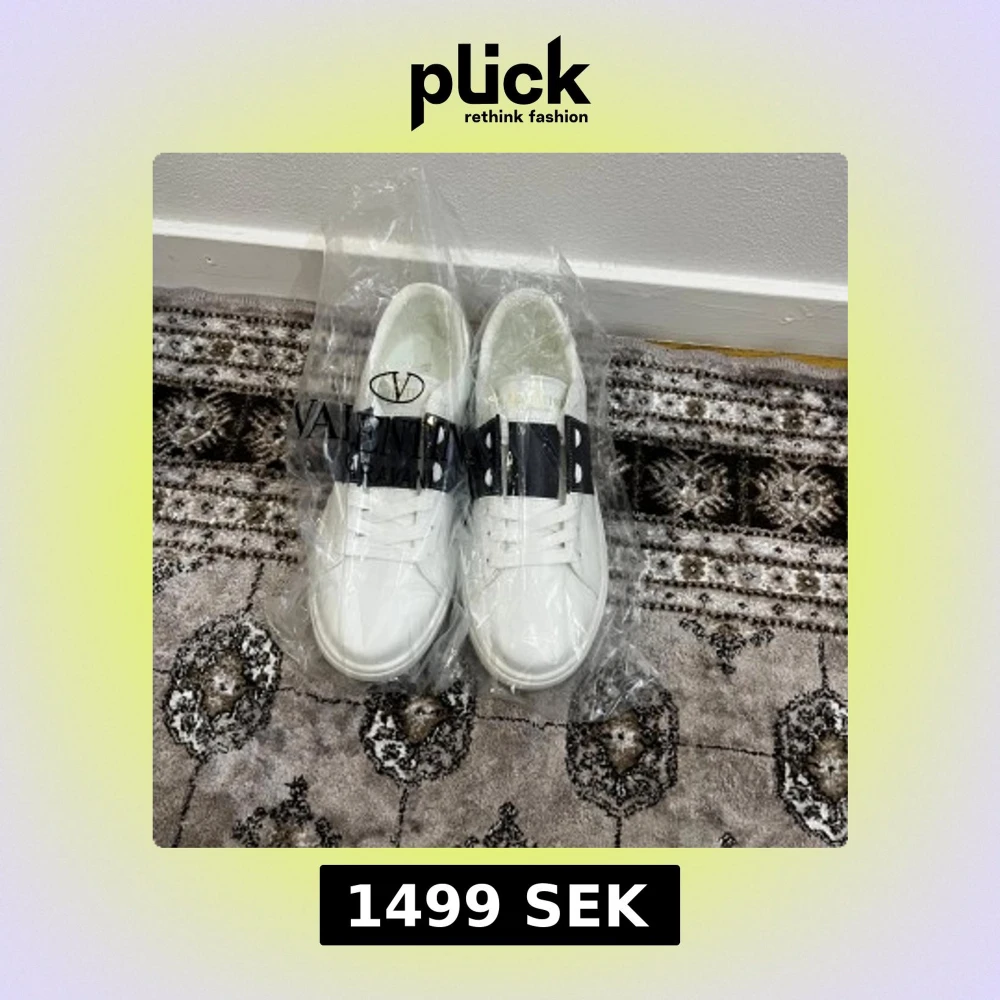 Säljer ett par vita sneakers från Valentino Garavani med ett svart band och vita nitar över vristen. Skorna har rund tå, platt sula och snörning. Märkeslogga i guld på plösen. Perfekta för dig som gillar stilrena och exklusiva sneakers.Helt oanvända med ingen box tyvärr
