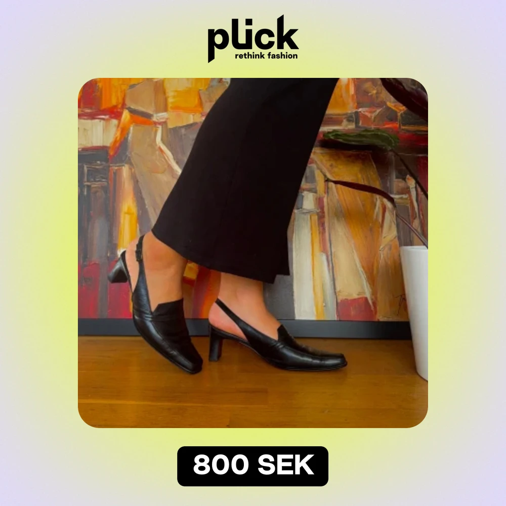 Säljer ett par eleganta svarta klackskor med spetsig tå. Skorna har en bekväm blockklack och en stilren design med en rem runt hälen. Perfekta för både vardag och fest!