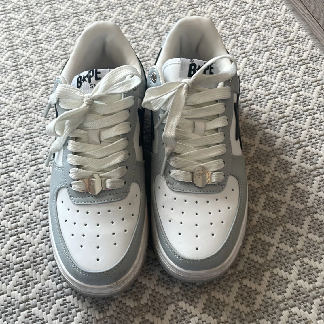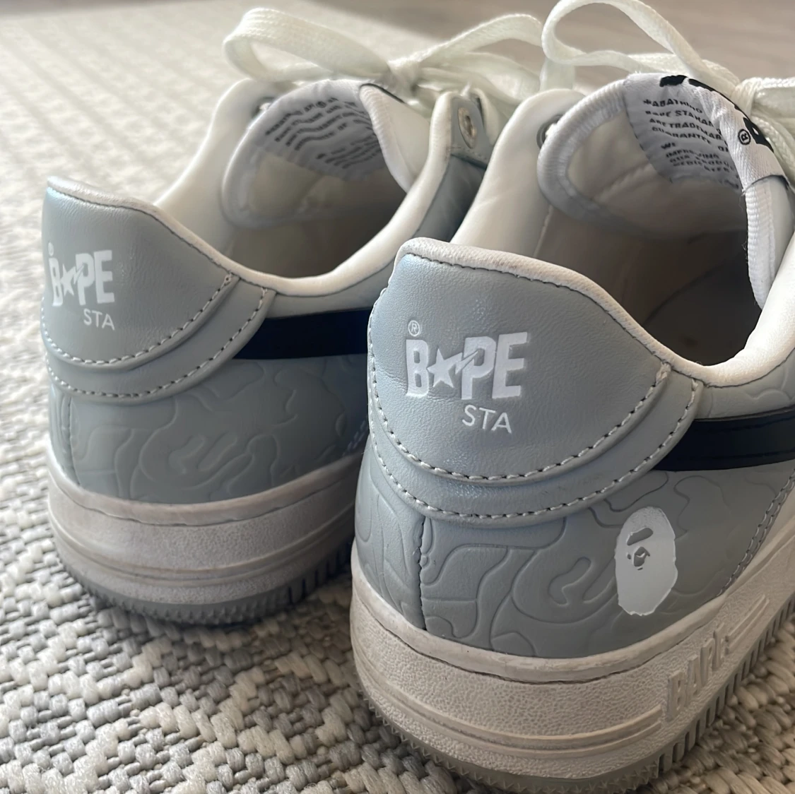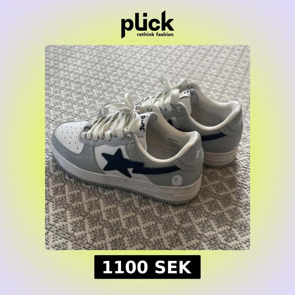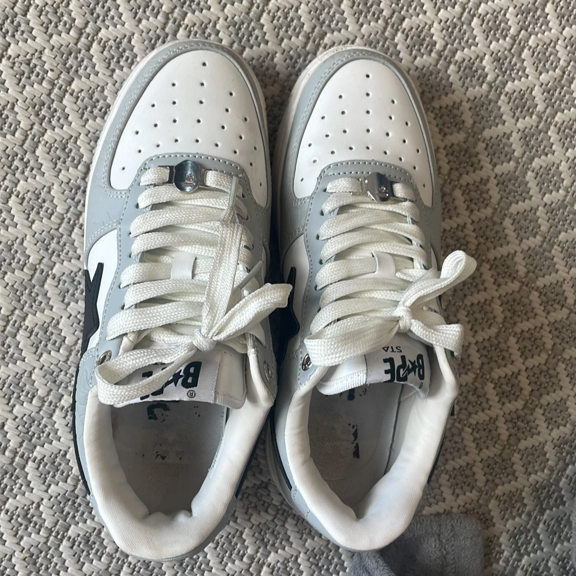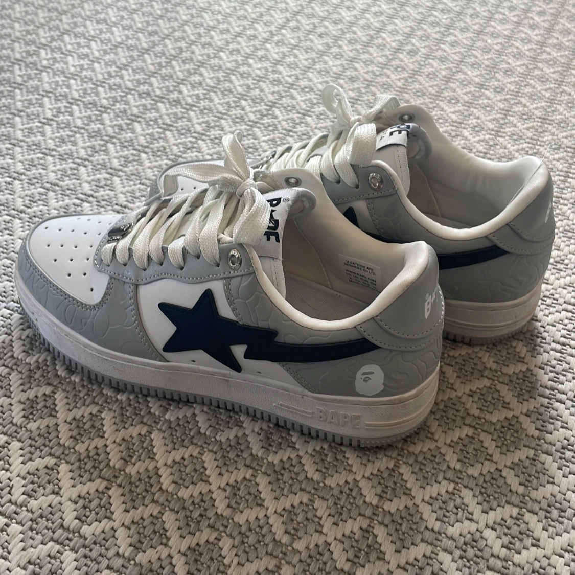 Snygga BAPE sneakers i grått och vitt med den ikoniska stjärndetaljen i svart på sidan. nästan inga tecken på användning då jag köpte för ungefär en månad sedan. Jag säljer dom för att dem är för små.