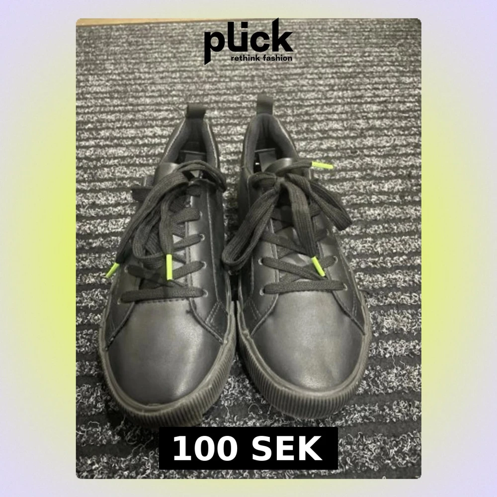 Svarta sneakers från H&M med limegröna detaljer och ett coolt vitt gaming-tryck på sidan där det står 'Game forevs' och en spelkontroll. Skorna unisex, i storlek 35 och inte jättemycket använda.