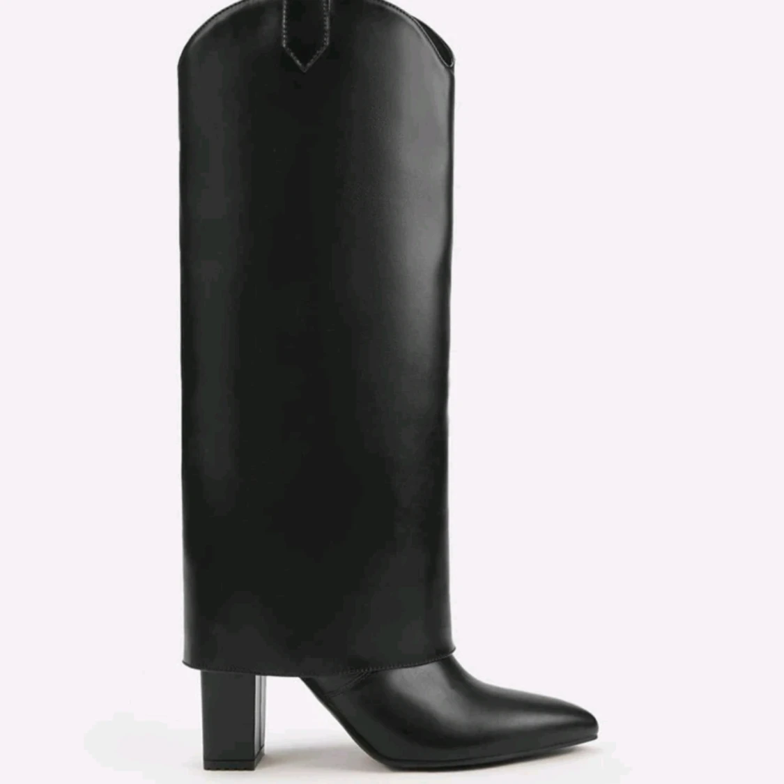 Svarta stövletter i läder/skinnimitation - helt nya i storlek 36. Sökord: överlappade, fold, vikt mudd,