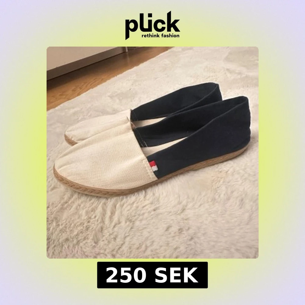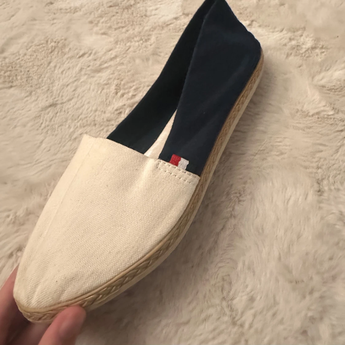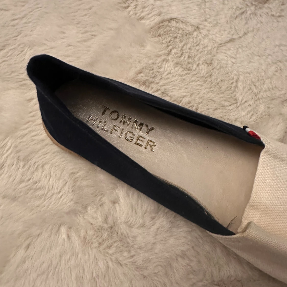 Snygga espadrillos från Tommy Hilfiger i marinblått och vitt tyg med naturfärgad flätad sula. Skorna har en klassisk, spetsig tå och liten logodetalj på sidan. Perfekta för sommaren och lätta att matcha till olika outfits. Köpt för flera år sedan.