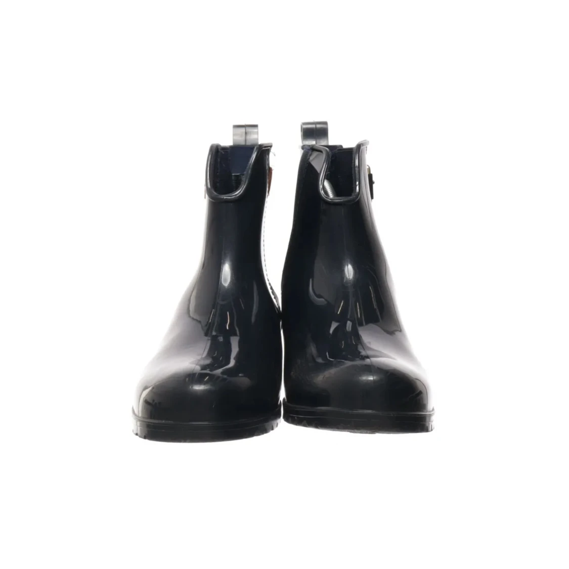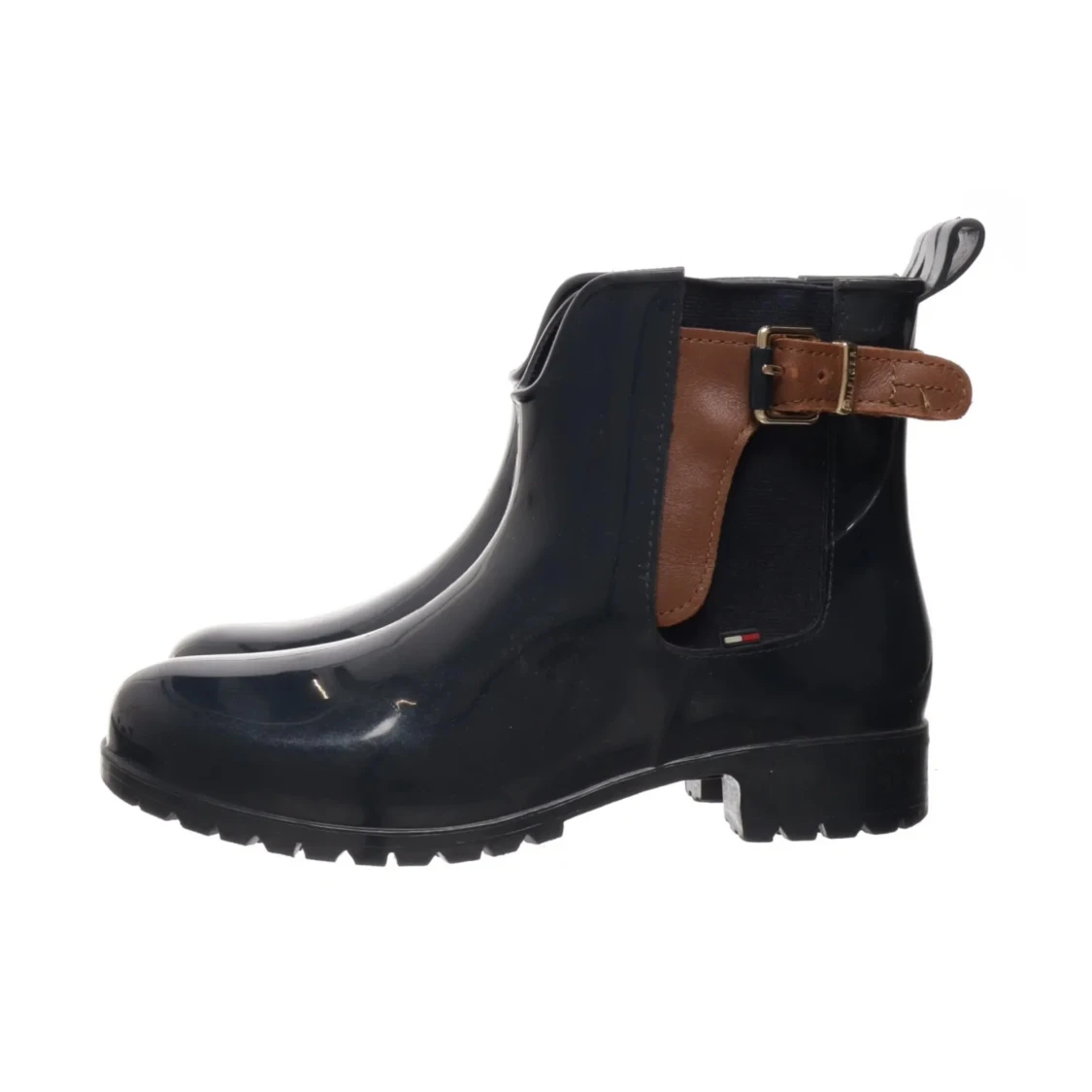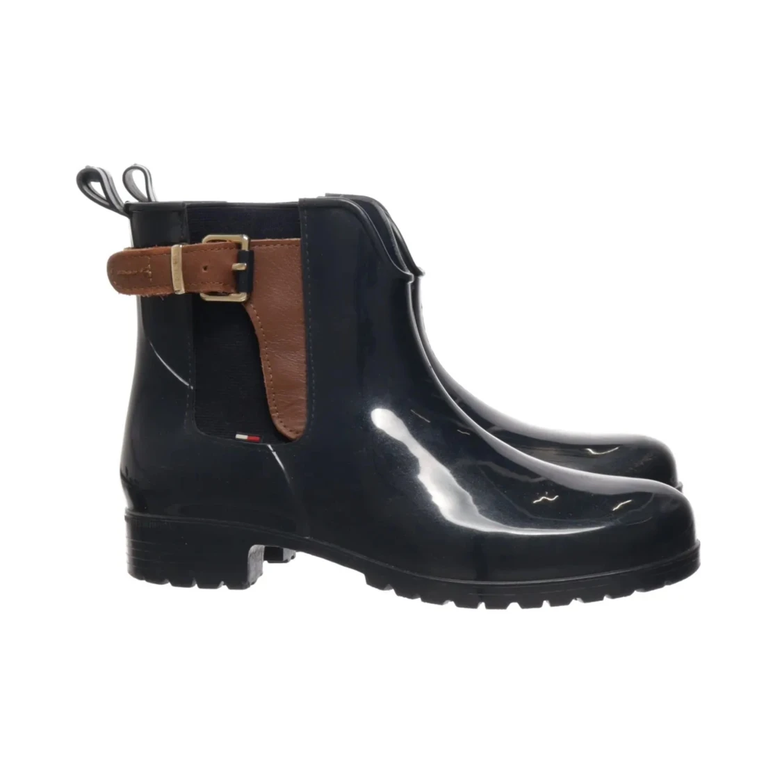 Ett par svarta stövletter med en blank yta och brunt spänne runt ankeln. Skorna har en låg klack och en dragflik baktill för enkel påtagning.