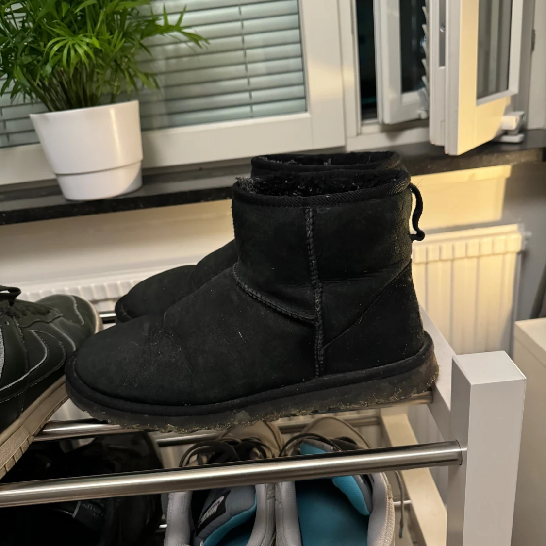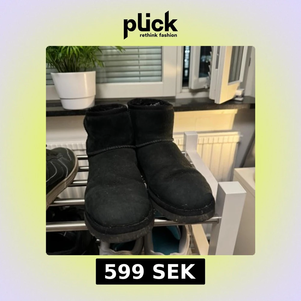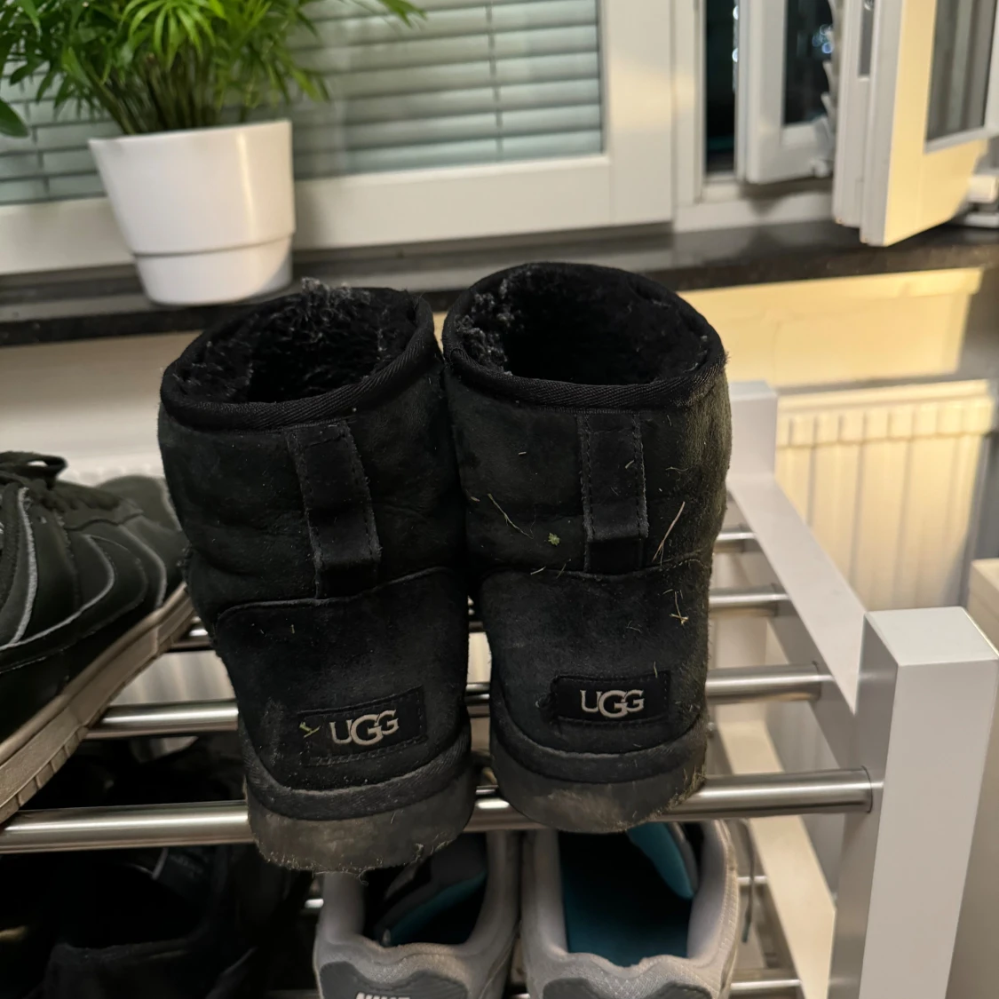 Mysiga svarta UGG boots med rund tå och platt sula. Utsidan är i mjuk mocka och insidan är fodrad med fluffigt material för extra värme. Klassisk UGG-logga baktill och enkel design som passar till chill outfits under kalla dagar.