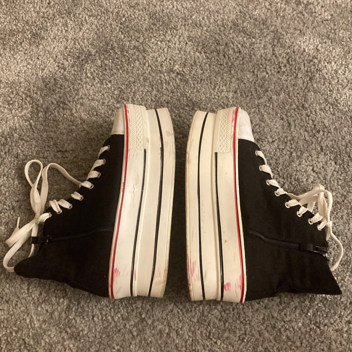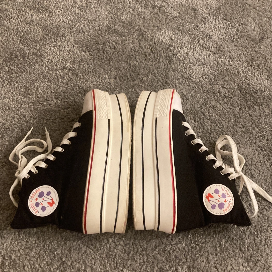 Svarta platĂ„skor liknande converse. Storlek 37. Nypris 600kr. Ok skick, i tyget och snören jĂ€ttefina men pĂ„ insidan av sulorna och fram pĂ„ tĂ„n finns defekter (se bilderna). Köparen stĂ„r för frakten.đ€