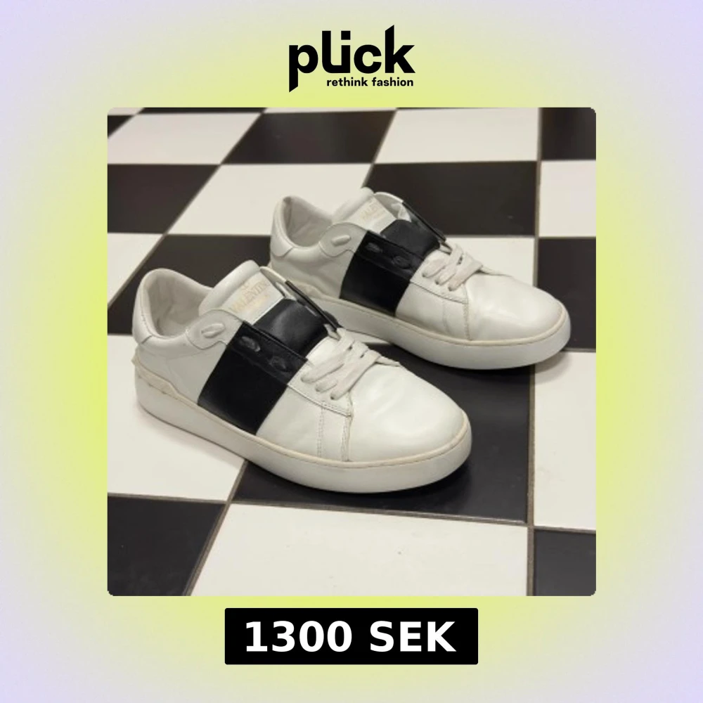 Snygga Valentino Garavani Open sneakers i vitt skinn med bred svart läderdetalj över mitten. Klassisk rund tå, platt sula och snörning framtill. Ikoniska nitar runt hälen ger extra edge. Perfekt för dig som gillar exklusiva och stilrena sneakers. Dom är i size 44 och är endast anväbdt ett fåtal gånger.