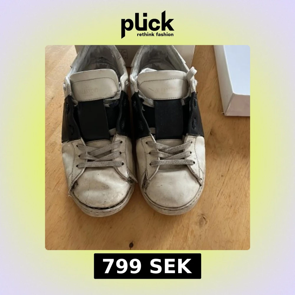 Säljer ett par Valentino Garavani Open sneakers i vit skinn med bred svart läderdetalj över sidan. Klassisk rund tå, platt sula och snörning framtill. Snygg kontrast mellan vitt och svart, perfekt för dig som gillar designer och streetstyle. Låda och dustbag ingår. Pris ej hugget i sten
