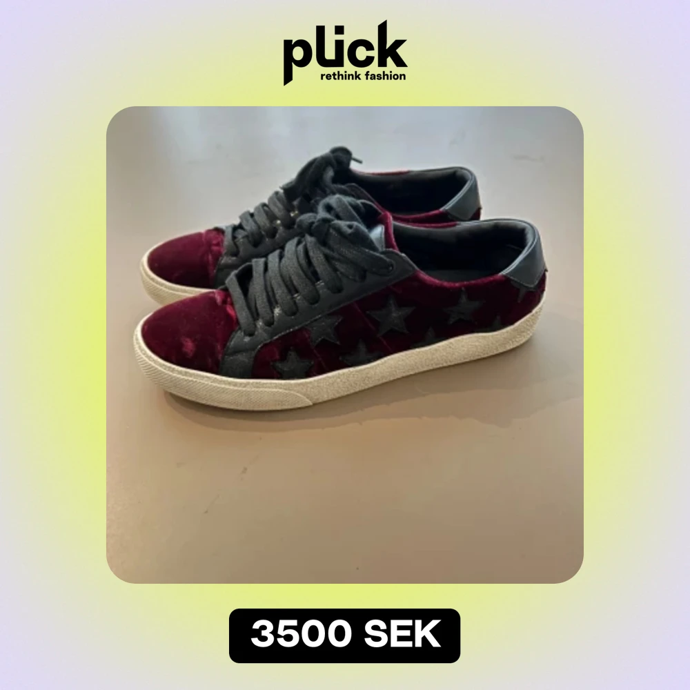 Svincoola och unika Saint Laurent sneakers i vinröd sammet med svarta stjärnor på. Väldigt bra skick då dom endast använts under en sensommar/höst-period. Passar perfekt på mig som har 37/38 i skor! Nypris:6800