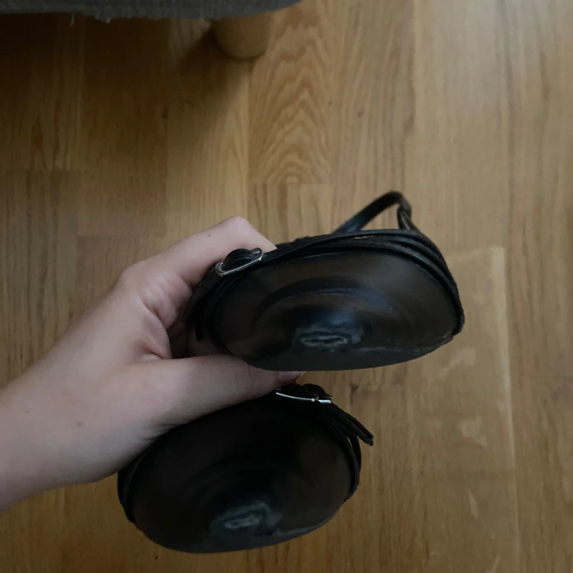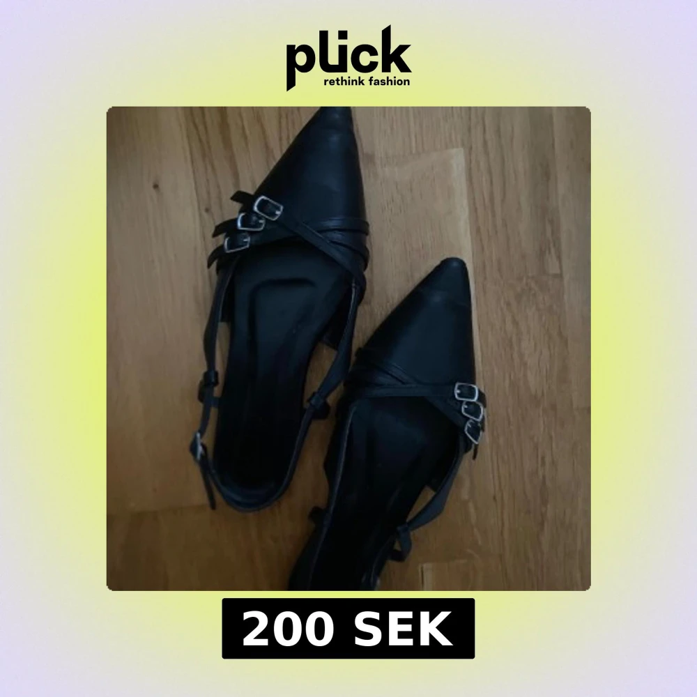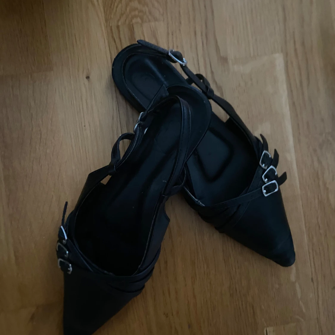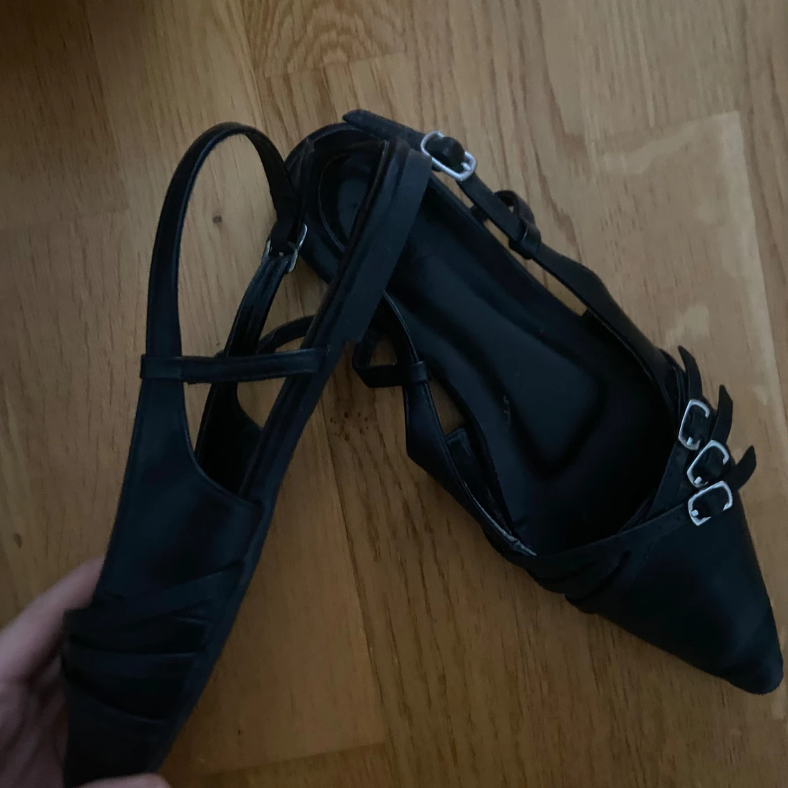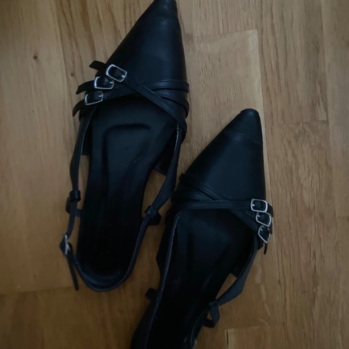 Svarta spetsiga platta skor med silver detaljer, lite slitna i tå spetsen