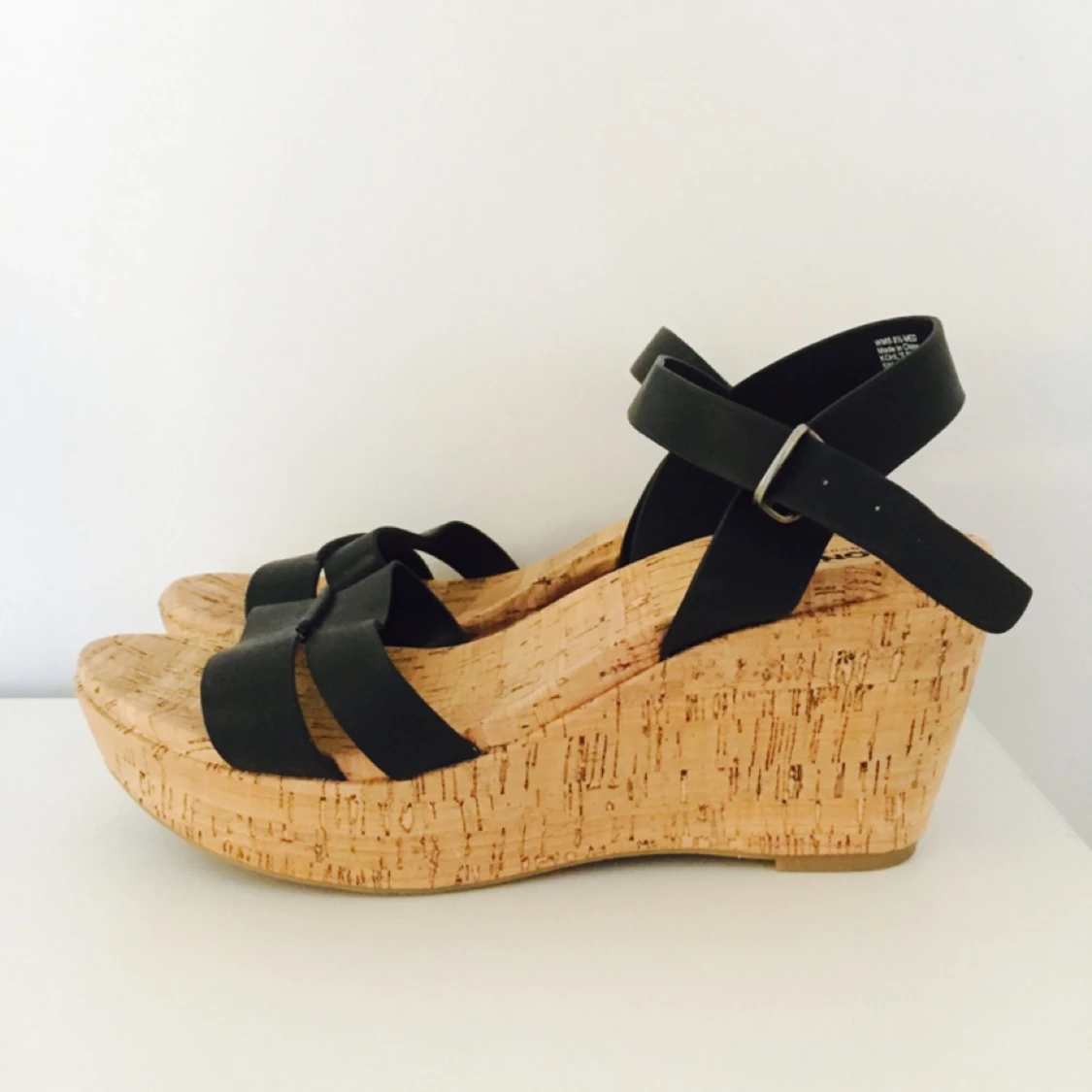 Helt nya kilklacksskor, US 8 1/2, strl 39. Klackhöjd ca 6-7cm. Reglerbara svarta band.
