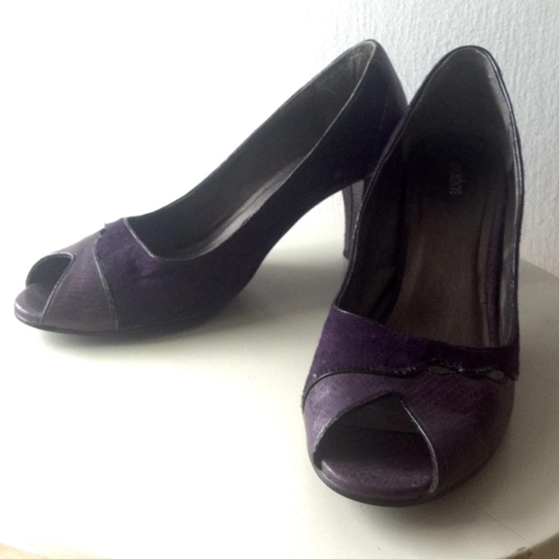 Underbart lila klackar med öppen tå! Fina detaljer i fram, se bild. Klack ca 5 cm. Mkt bra skick.