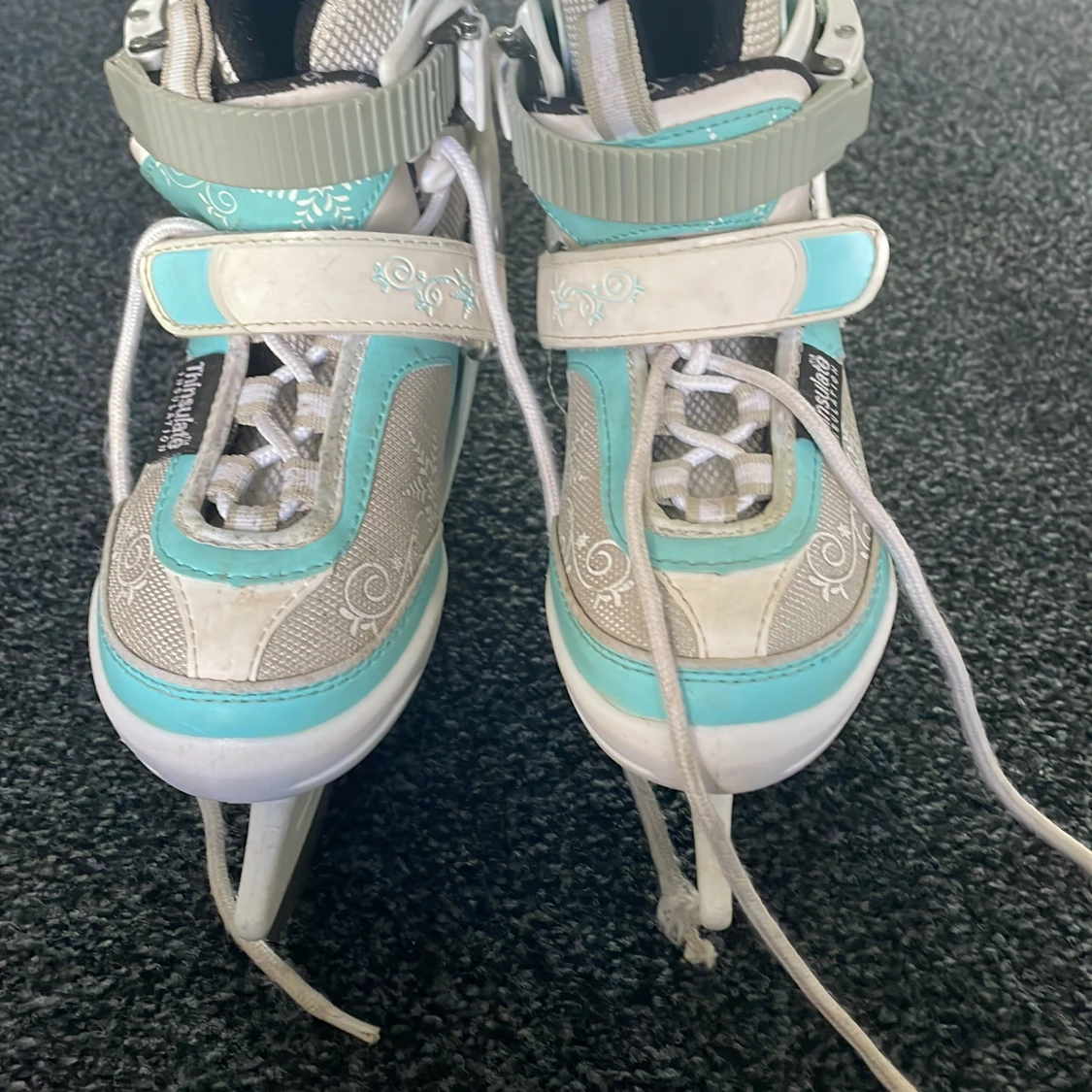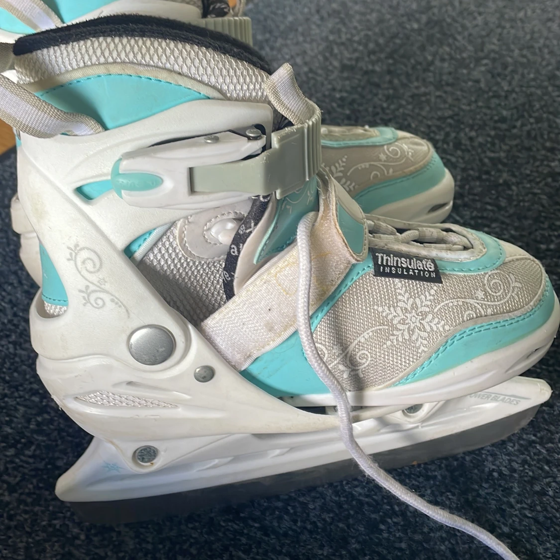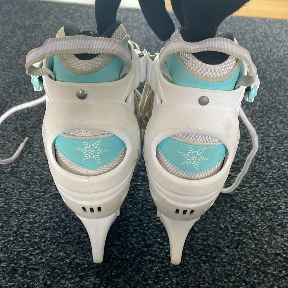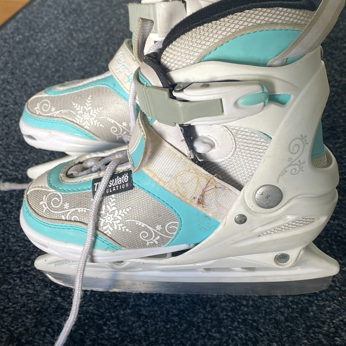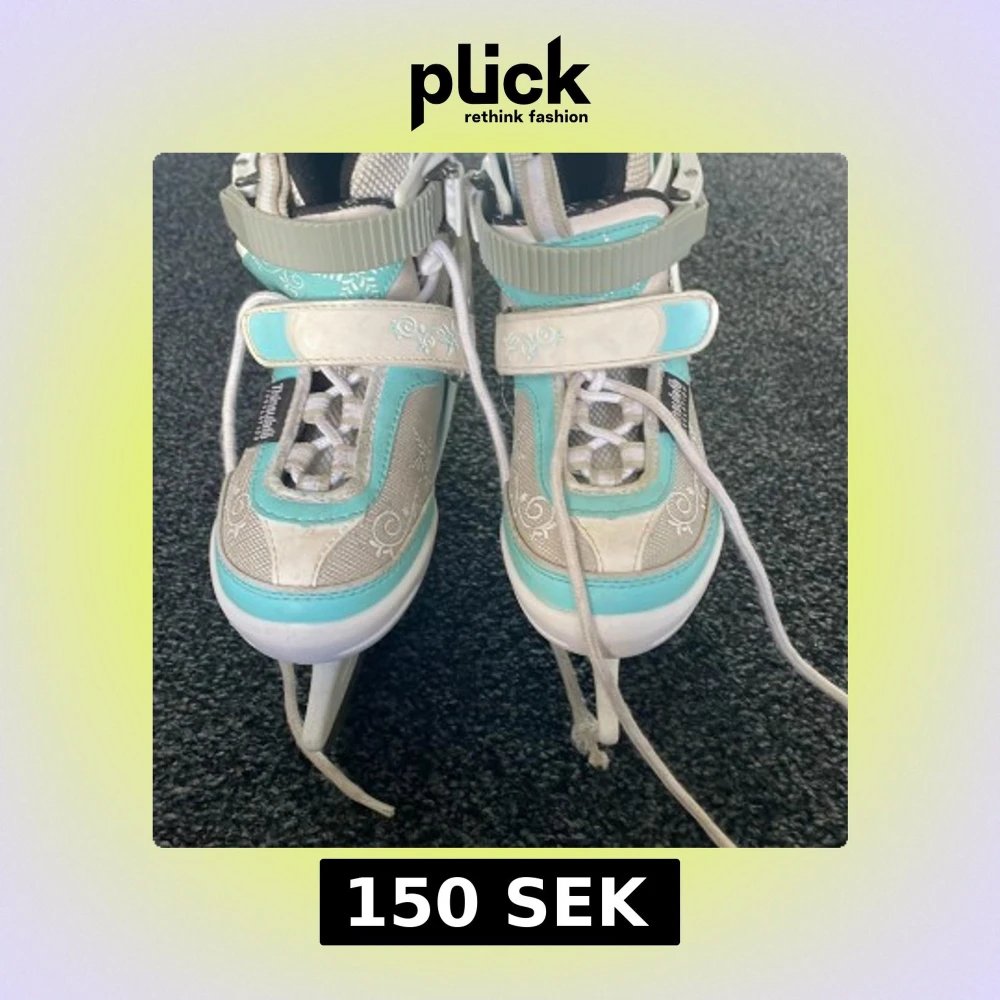 Blå,vita och silver skridskor med snöflingor detaljer med små stjärnor lite överallt. Har använts några par gånger, lite smutsigt men dem punkar exakt som dem ska. Perfekt för vinterperioden om mane sugen på att åka skridskor.