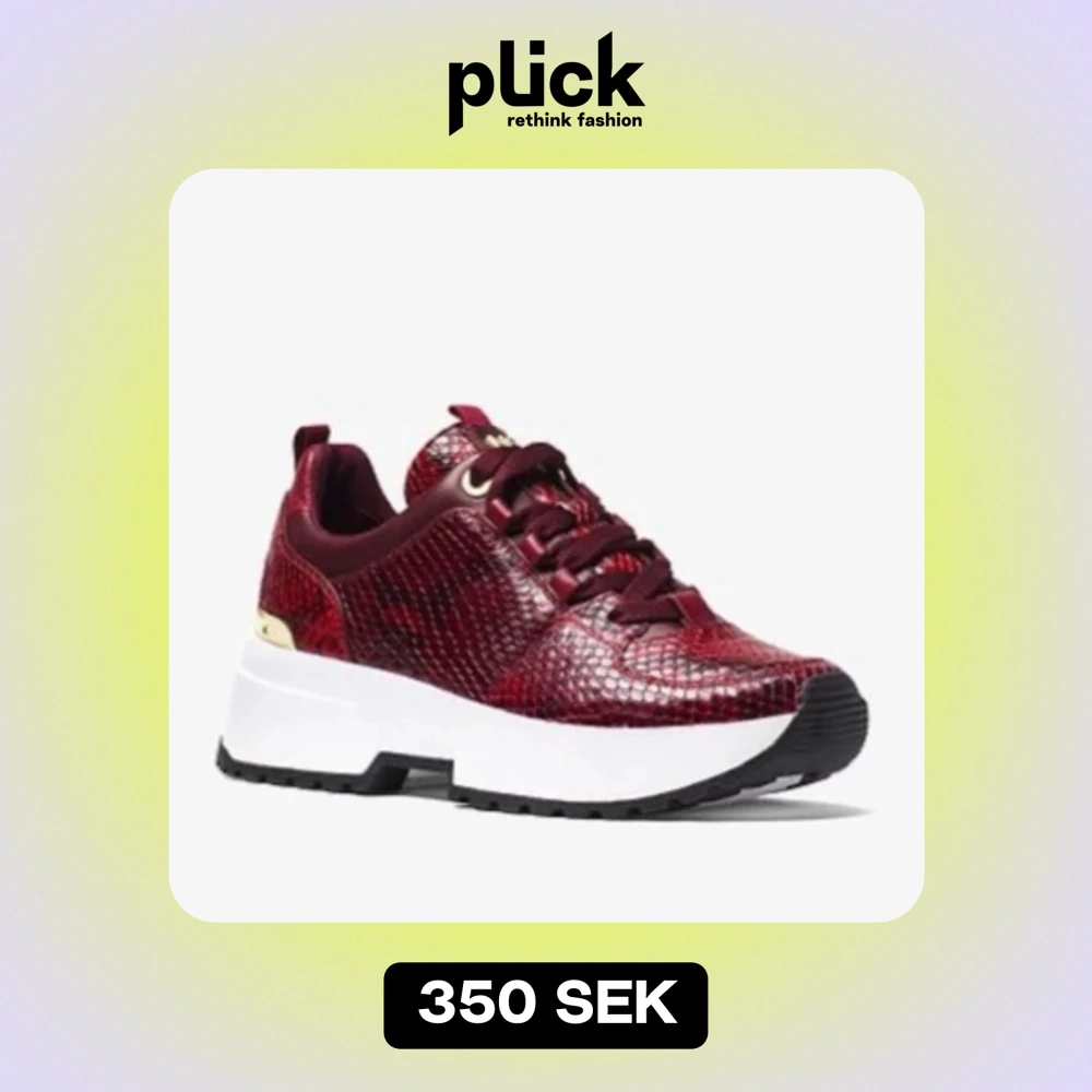 Sneakers i vinröd snakeskinn från Michael kors. Guldiga detaljer. Använda men i fint skick, nyputsade. Något slitage på gulddetaljerna se bild