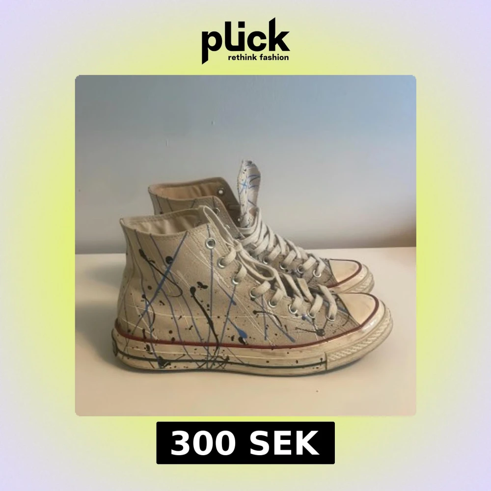 Säljer ett par ”cream” vita Converse All Star high-top sneakers med färgstänksmönster i blått och svart. Storlek 44,5 (29cm). Ingen OG box och vissa defekter (skriv för fler bilder).