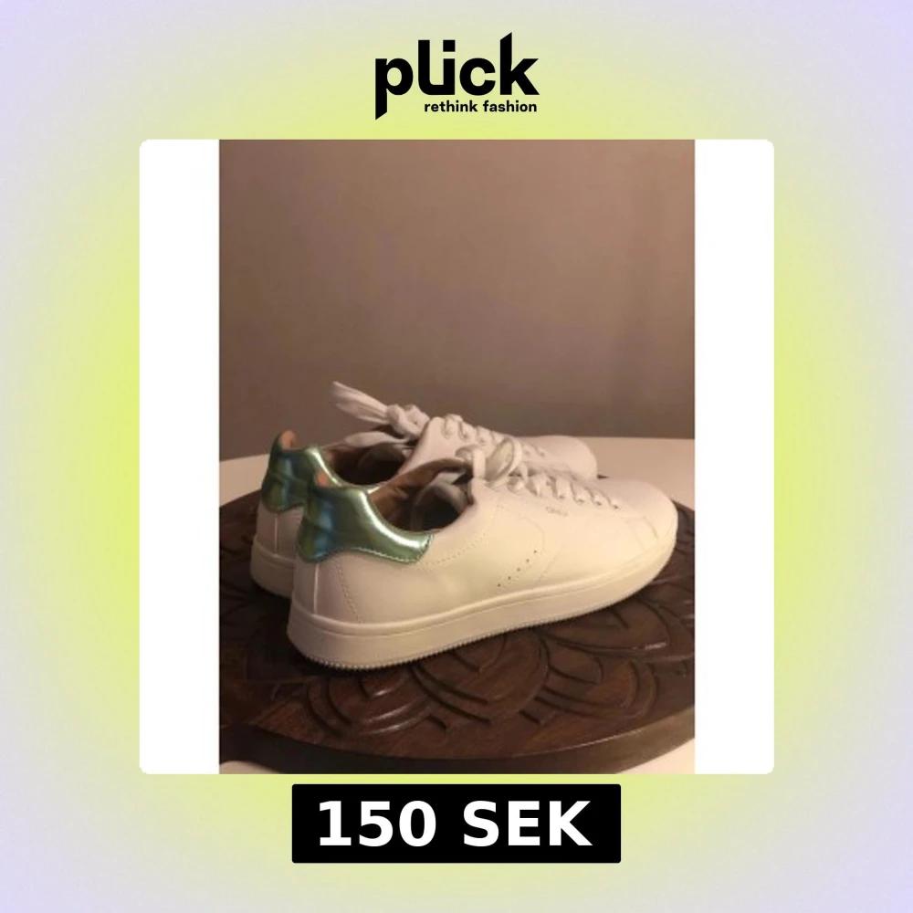 Snygga vita sneakers från ONLY med klassisk rund tå och snörning. Skorna har en unik metallicgrön detalj på hälen som ger en cool touch. Tillverkade i syntetmaterial med platt sula, perfekta för dig som vill sticka ut lite extra. Storlek 38