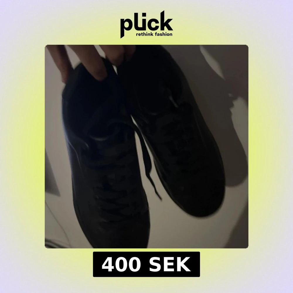 Säljer ett par helsvarta sneakers med klassisk design och rund tå. Skorna har platt sula och snörning framtill. Perfekta för en clean och stilren look. Materialet ser ut att vara syntet eller skinnliknande.