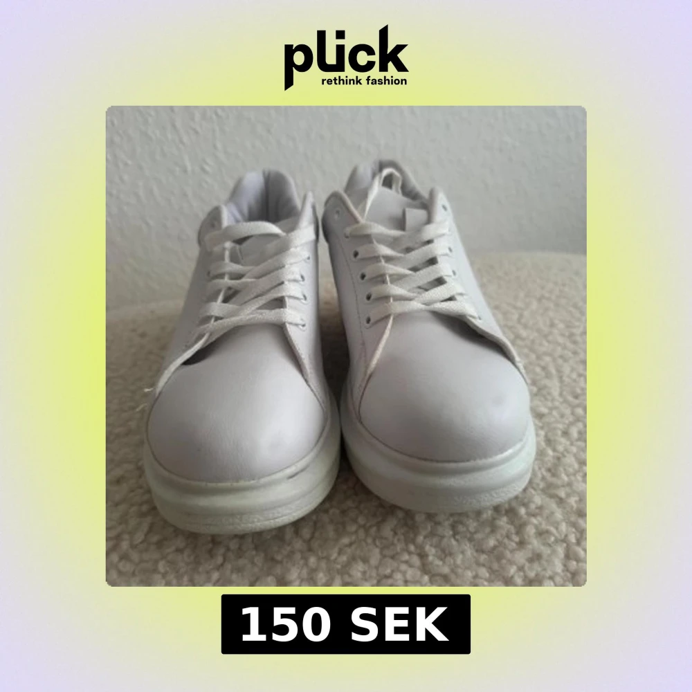 Klassiska vita sneakers från NLY Shoes i storlek 37. Skorna har rund tå, snörning och en chunky platt sula. Tillverkade i syntetmaterial och polyester med bomull i fodret. Perfekta för en clean och stilren look. Använd en gång.