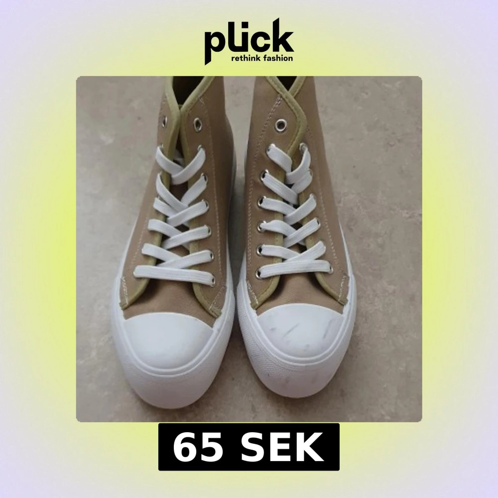 Snygga beige sneakers med högt skaft och vit platt sula. Skorna har vita snören, silverfärgade öljetter och förstärkt vit tå. Tillverkade i canvasmaterial med ljusbeige kant runt öppningen. Perfekt för dig som gillar klassisk streetstil.