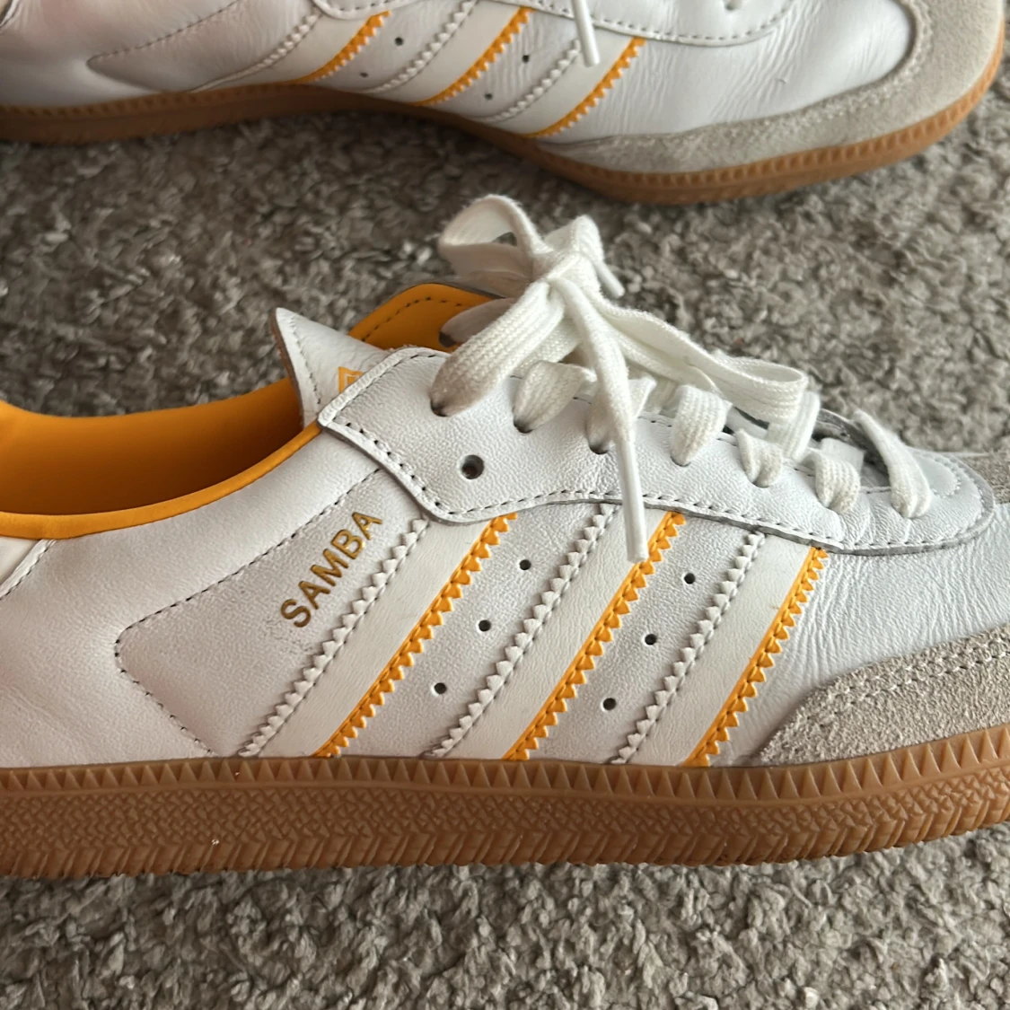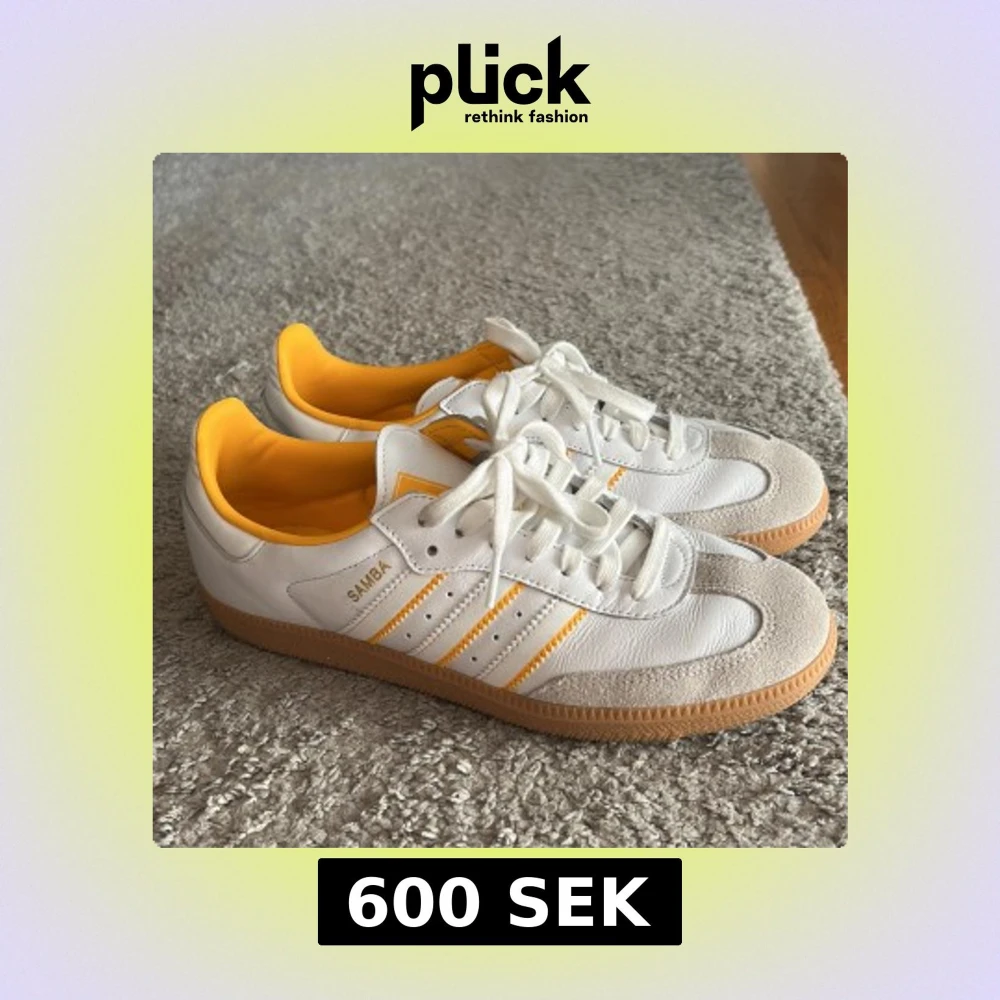 Fräscha Adidas Samba sneakers i vitt skinn med gula detaljer och klassiska tre ränder på sidan. Skorna har vit snörning, gummisula och beige mockadetaljer vid tån. Insidan är fodrad i gult för en extra pop av färg. Perfekta för dig som gillar retrostil och streetwear.