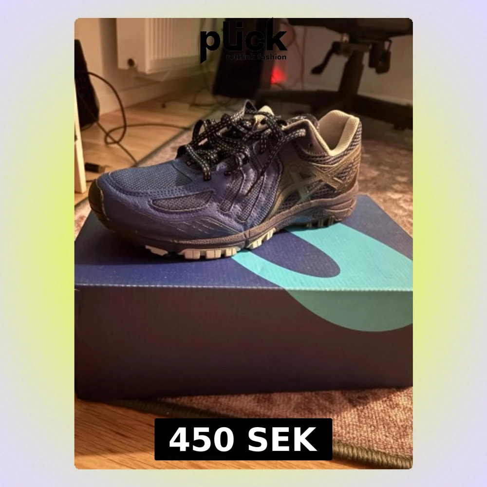 Säljer ett par blå oanvända Asics sneakers med svart och vit mönstrad snörning. Skorna har meshpaneler för bra ventilation och detaljer i syntetmaterial. Yttersulan är grov för extra grepp och insidan är ljusgrå. Perfekt för dig som gillar sportig stil.