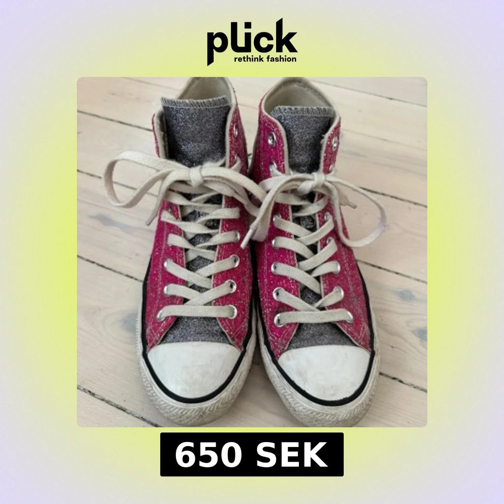 Säljer mina snygga Converse All Star i rosa glitter!💖Köpte dessa för mer än två år sedan inför min student och har inte använts sedan dess. Bortsett från lite smuts är de i grymt skick. Kartongen har jag tyvärr råkat slänga. Skorna är i storlek 39,5 och passar mig som vanligtvis har storlek 40😊