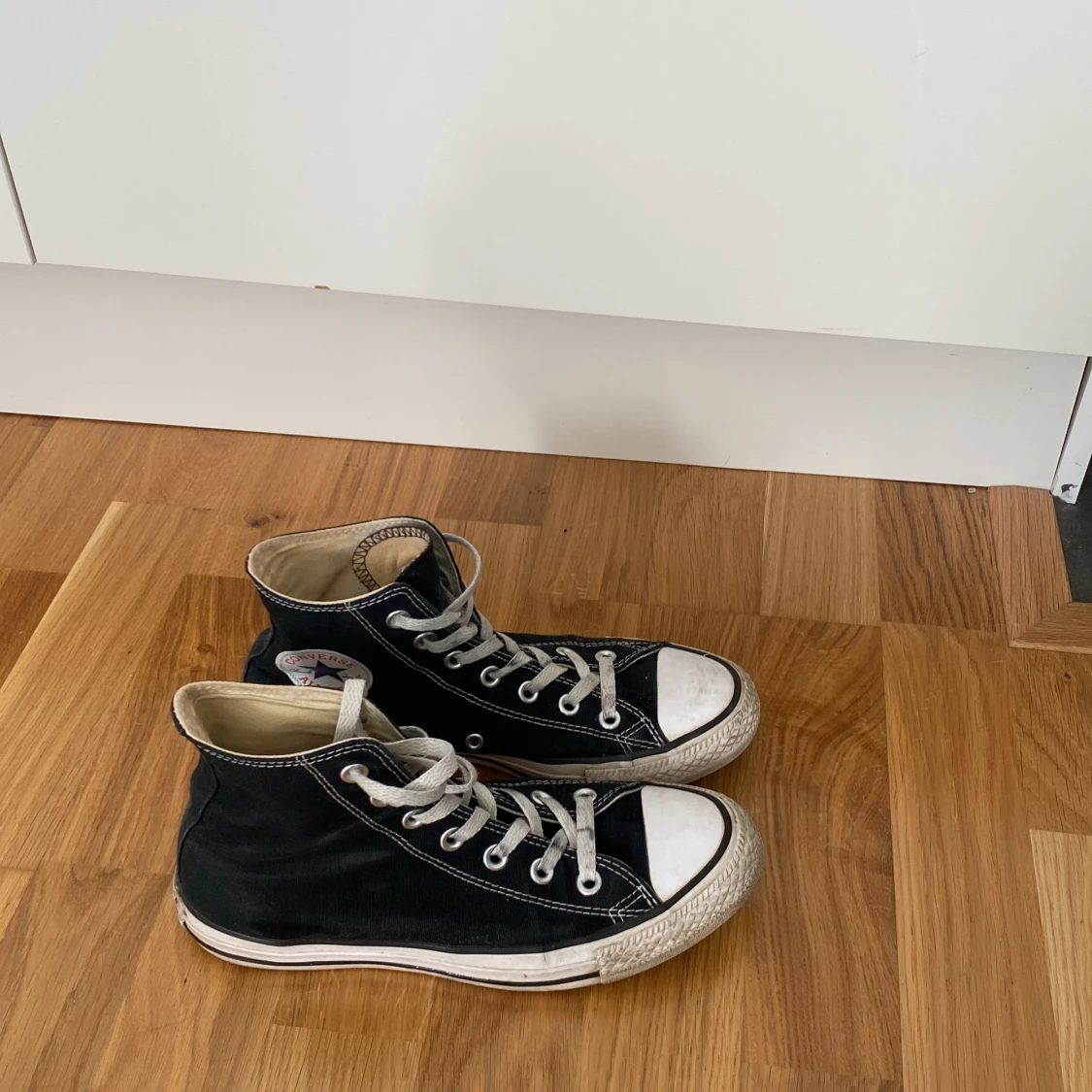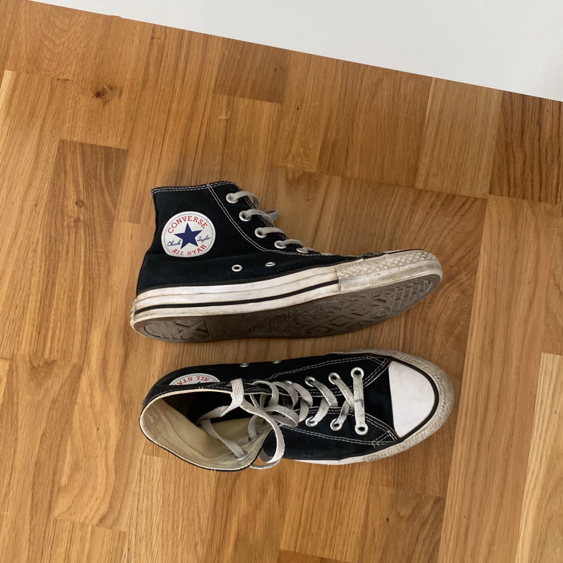 Säljer mina svarta höga Converse i storlek 38 som jag köpte här på Plick för ca 1 år sedan. Sparsamt använda av mig men de är i använt skick.