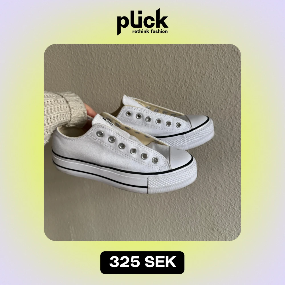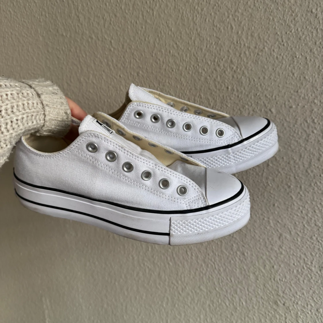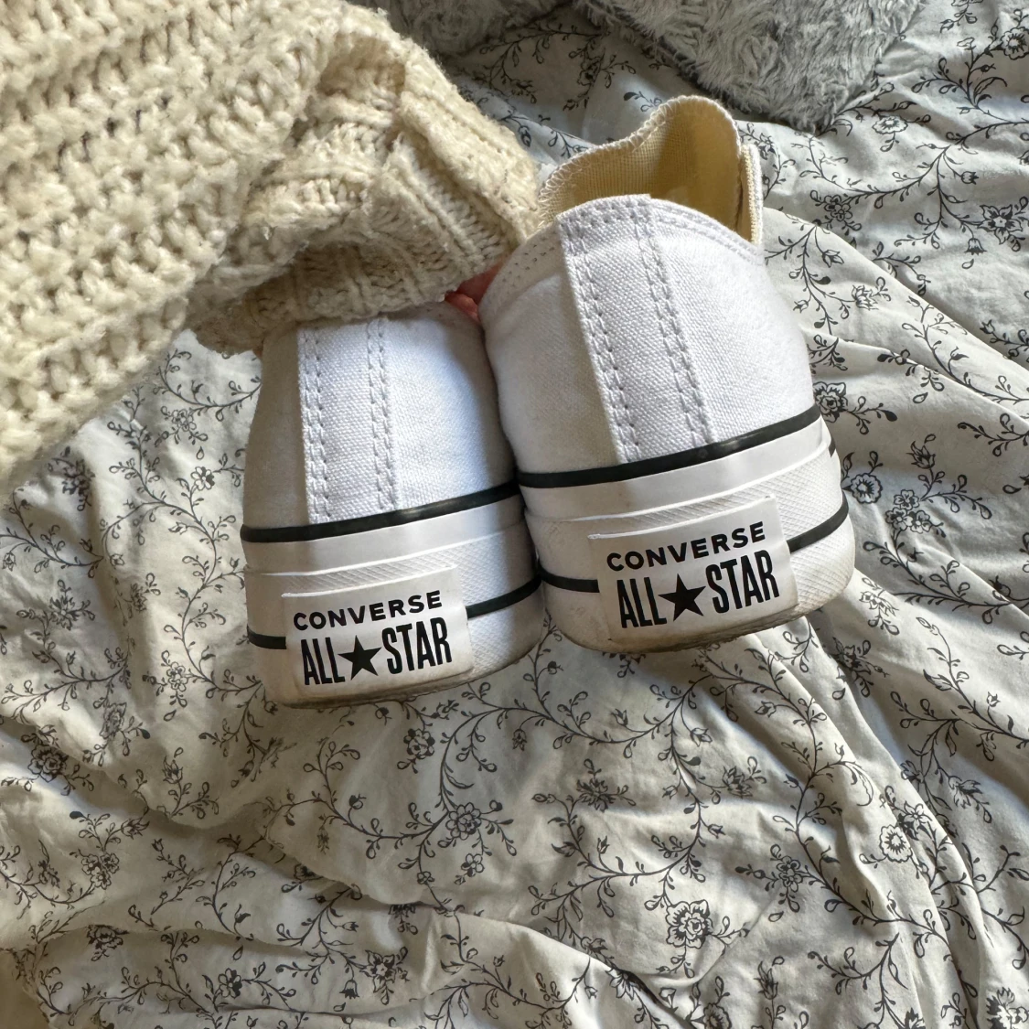 Säljer ett par klassiska vita Converse All Star sneakers i bra skick med plattform. Sparsamt använda! Säljes utan snören.