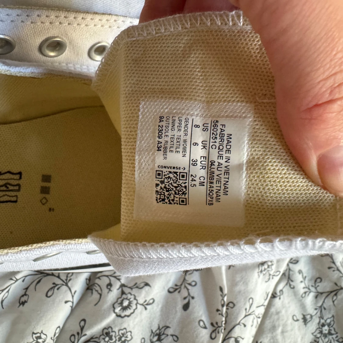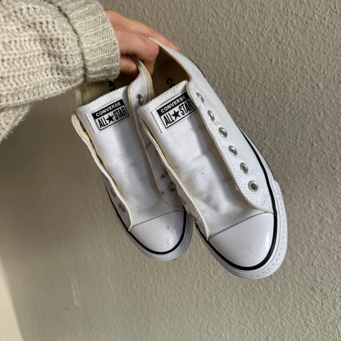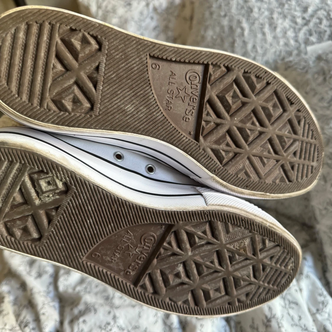 Säljer ett par klassiska vita Converse All Star sneakers i bra skick med plattform. Sparsamt använda! Säljes utan snören.