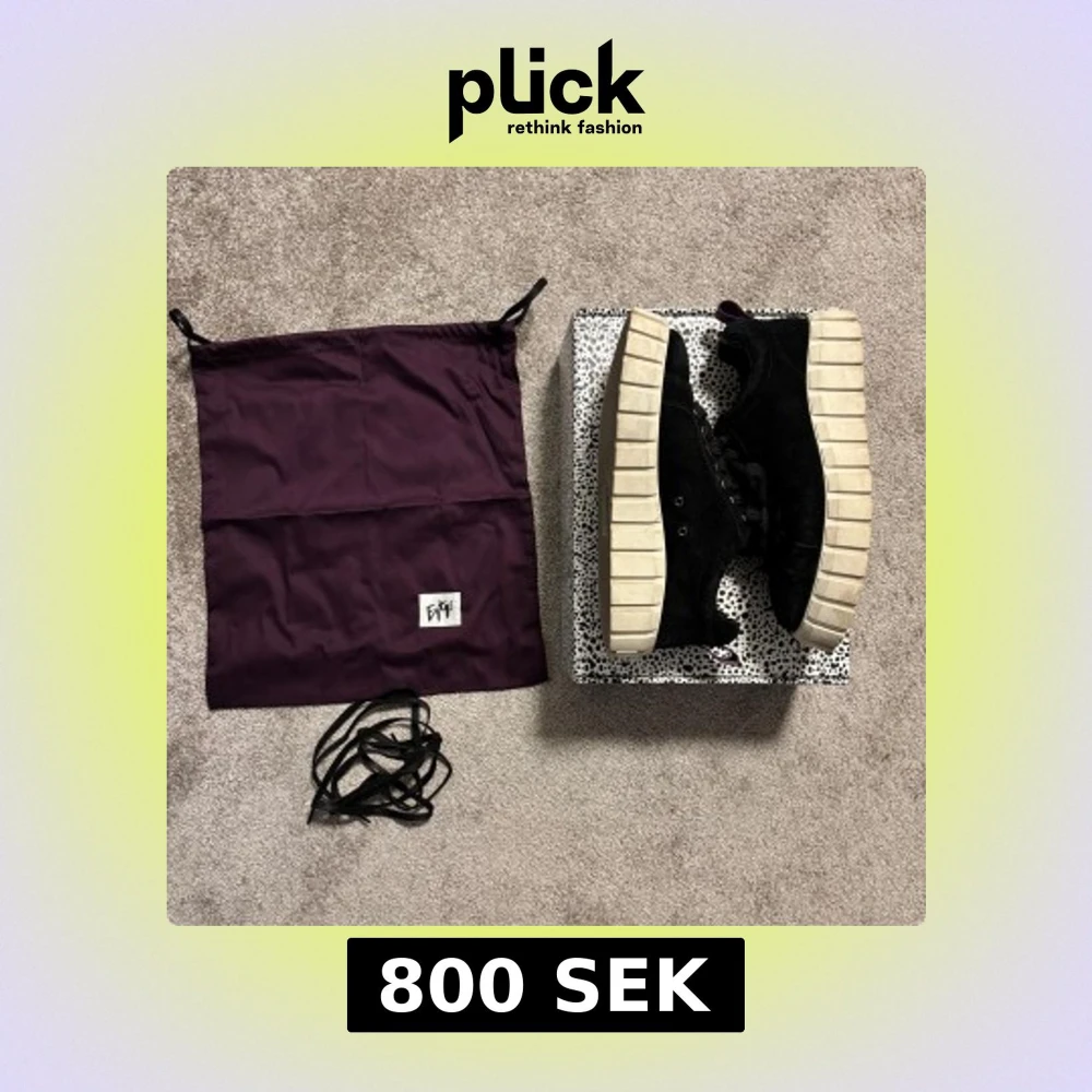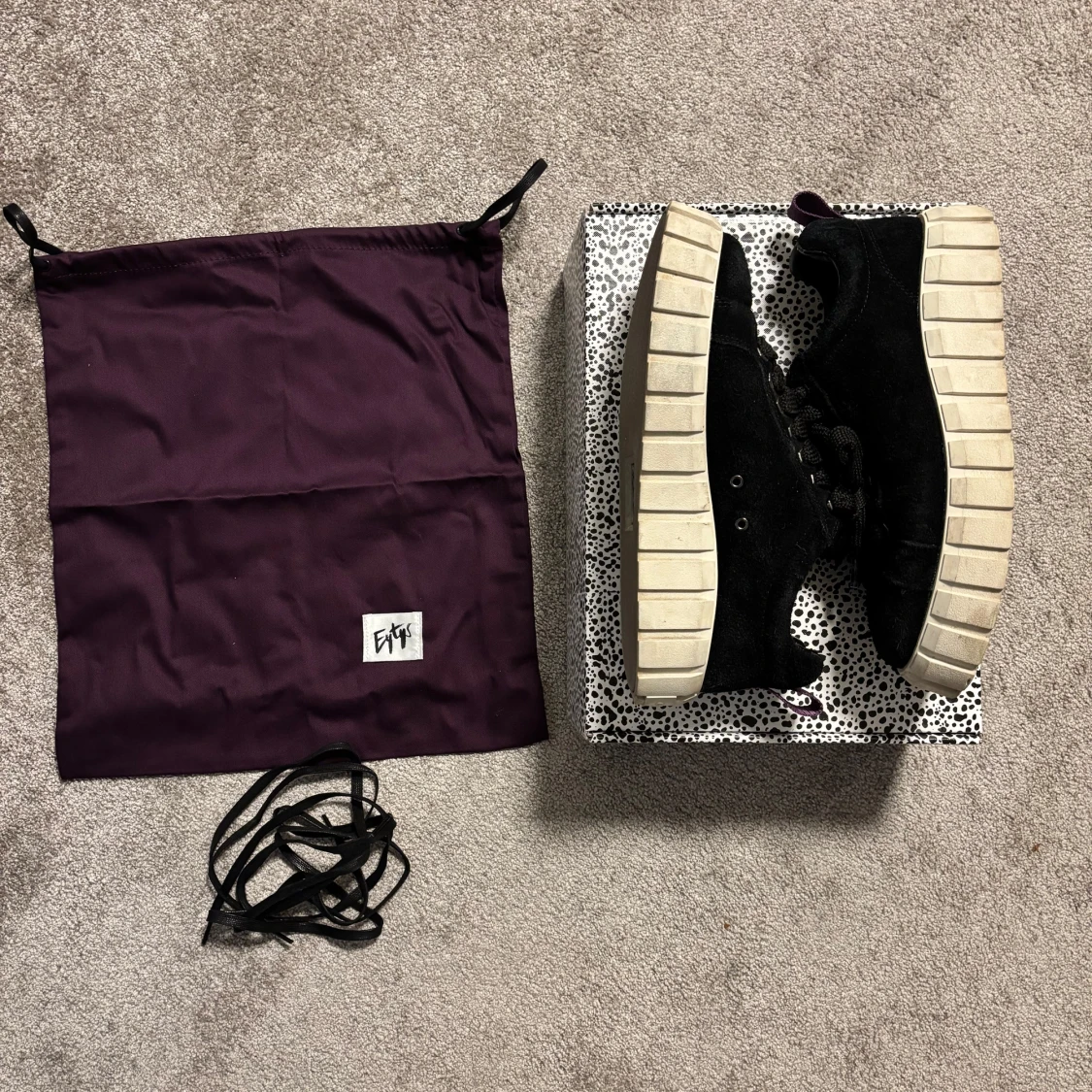 Säljer ett par svarta sneakers från Eytys med kraftig vit platåsula och snörning. Skorna är i mocka och har en chunky design som ger en cool och modern look. Medföljer originalpåse, box och extra skosnören.