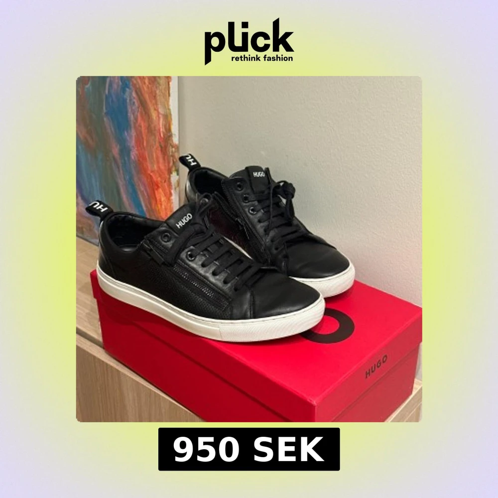 Snygga svarta sneakers från Hugo Boss med vit sula, perforerade sidopaneler och dragkedjedetalj. Skorna har snörning, rund tå och är tillverkade i skinn. Diskret Hugo-logga på plös och hälflik. Perfekta för en clean och stilren look. Storlek 41 modell: Futurism tenn