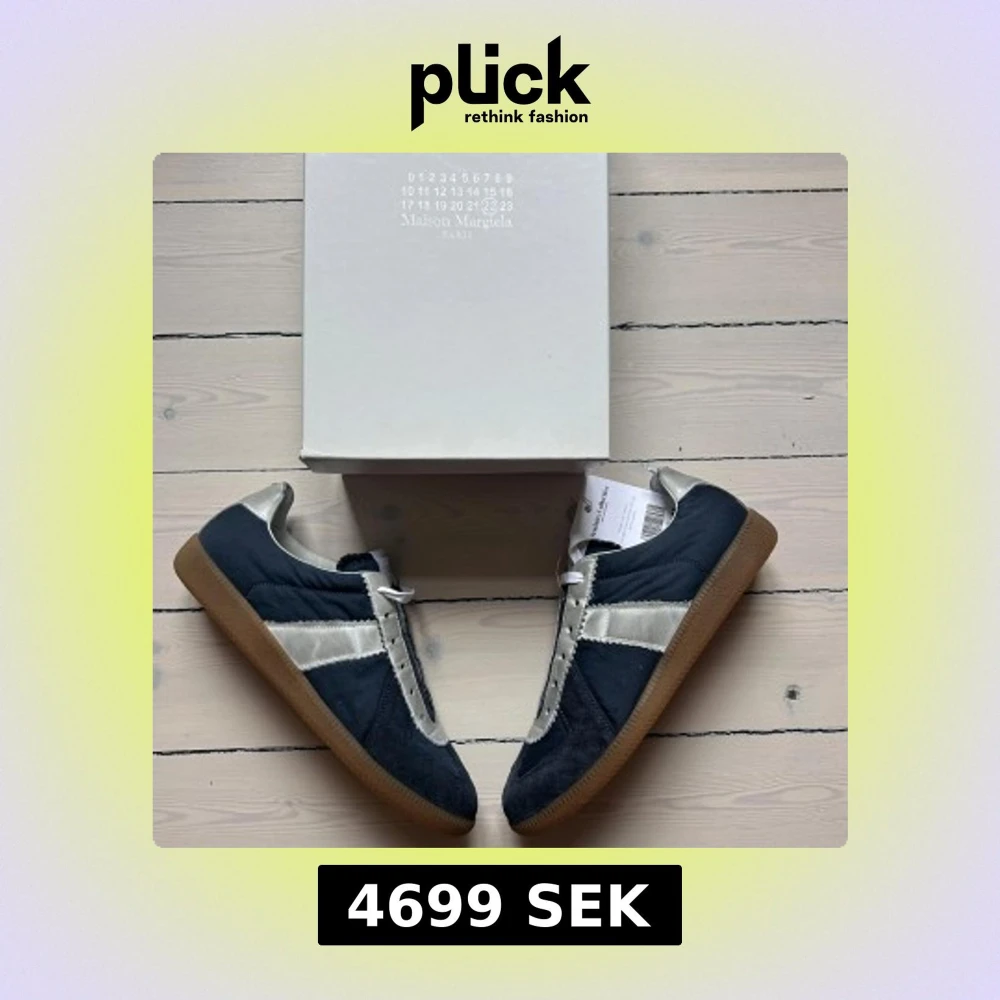 Maison Margiela sneakers med marinblå mocka och textil, silverfärgade detaljer i skinn och klassisk gummisula. Snygg kontrast mellan färgerna och ikonisk design med vita snören och märkets logga på plösen. Perfekta för dig som gillar stilrena men unika sneakers. Tillkommer Box och dustbag + authentication bevis från Vestiaire Collective. (HELT NYA)