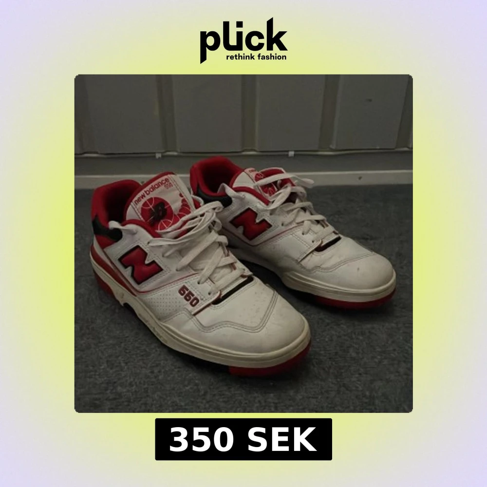 Säljer ett par New Balance 550, röd, svart och vit, använda sparsamt det ända skadan är en spricka på vänster skon men annars sparsamt använda!