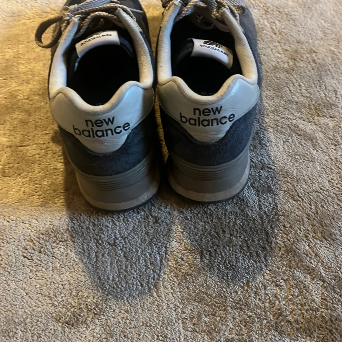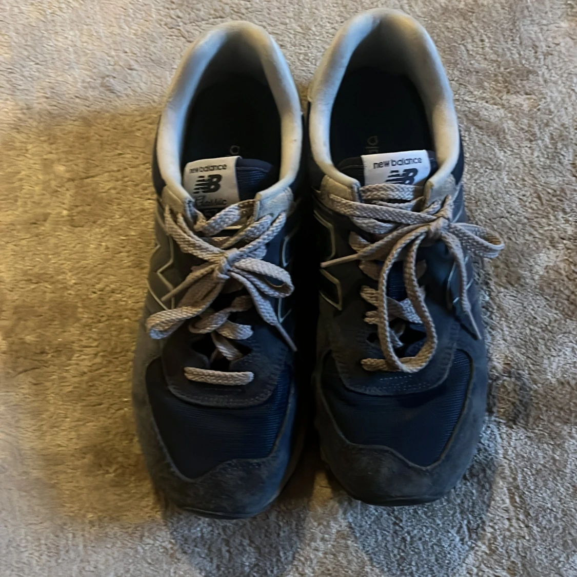 Säljer ett par klassiska mörkblåa New Balance sneakers med grå detaljer och vita loggor på hälen. Skorna har snörning och en robust, mönstrad sula som ger bra grepp. Perfekta för en avslappnad och sportig stil. Skriv om ni har frågor!