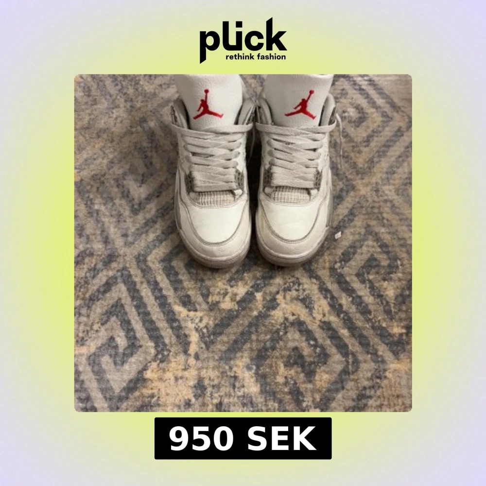 Säljer ett par klassiska Jordan 4s i White Oreo med Crease Skydd. Skorna har snörning och en ikonisk design som passar perfekt för sneakerheads. Skorna är ungefär 6 månader gamla utan några tydliga skador.