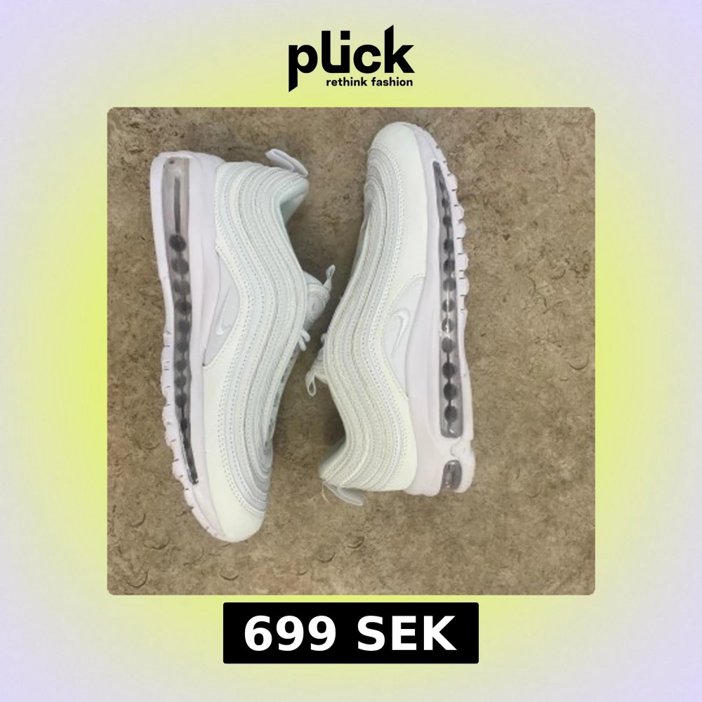 Nike Air Max 97 sneakers i helvitt med ikonisk vågig design och synlig Air-sula. Skorna har snörning, rund tå och platt sula. Materialet är en mix av syntet och textil, med diskret Nike-logga på sidan och innersulan. Perfekt för dig som gillar clean och sportig stil.